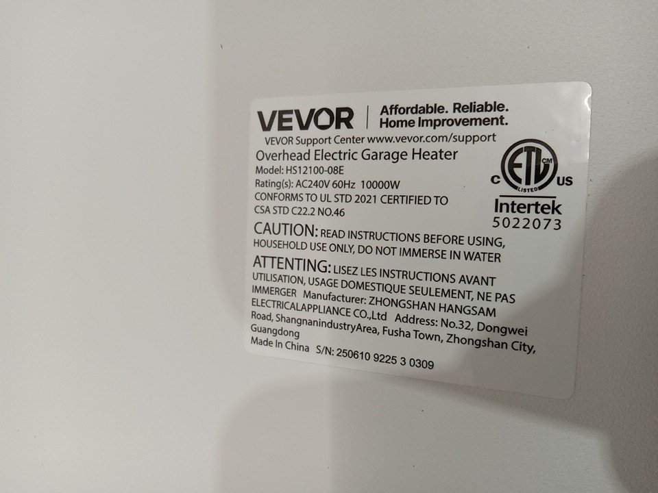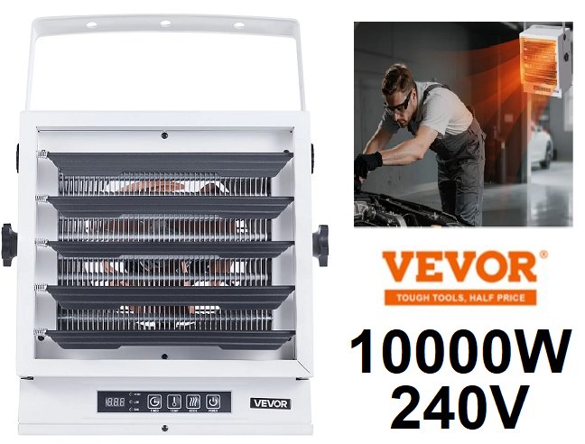 VEVOR hard-wired fan-forced electric garage heater with remote control - 10,000W / 240V - WHITE (model: hs12100-08E)