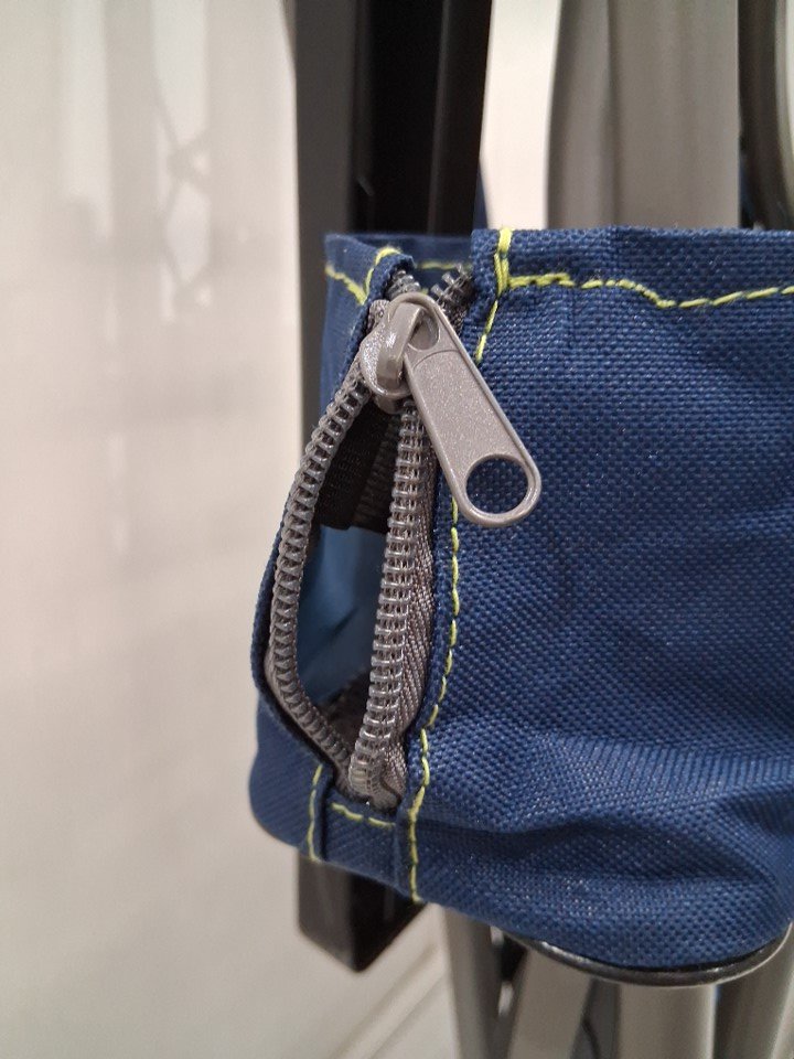 The zipper on the cupholder is out of alignment and doesn't zip shut as intended - see photos. Otherwise appears to be in new condition, though there may be some dust/dirt on the chair during pickup as a result of storage and handling in our facility without any packaging.