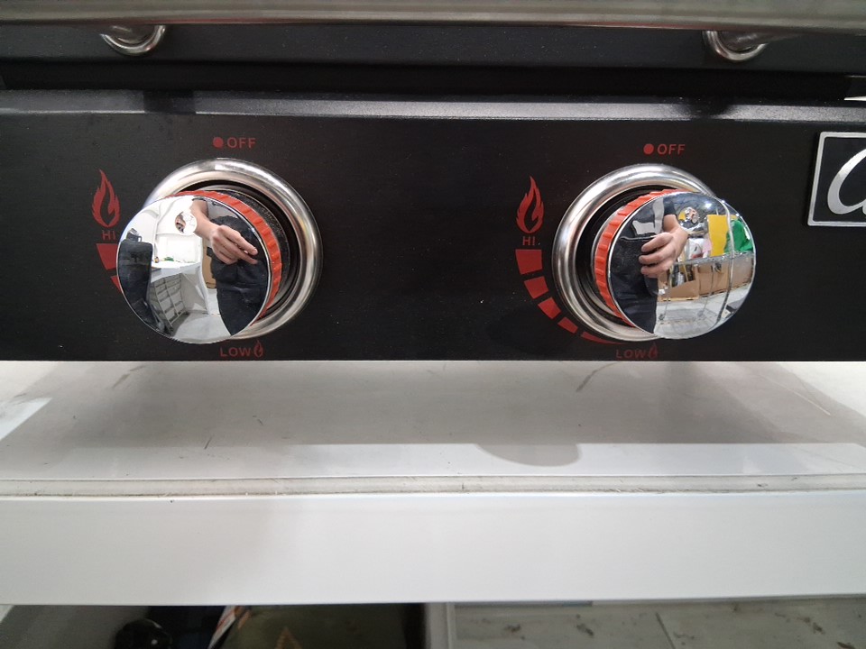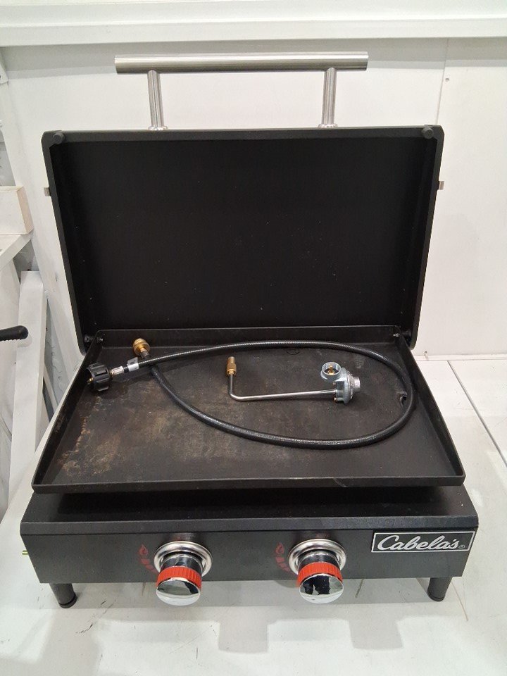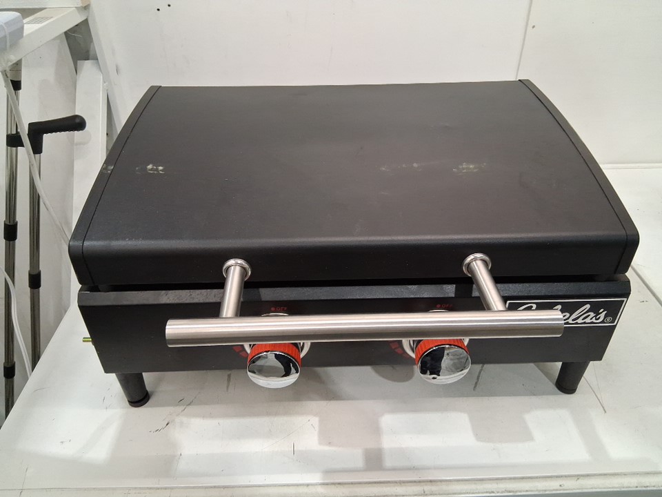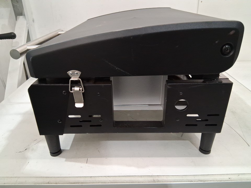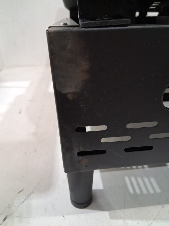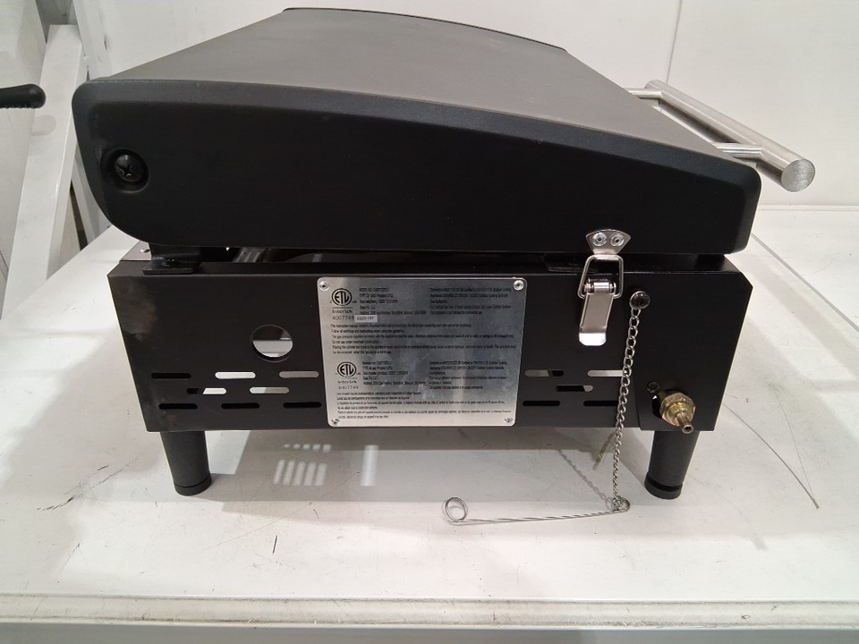 There are some scorch marks/grease stains left on the cooking surface indicating some prior use. There are also some dirt stains and light scuffs on the surface of the hood and on the left side of the grill, either from prior use or shipping without any packagine - see photos. Outside of these issues, the grill appears to be in good condition without any notable damage that would impede function, though we are unable to fully test its function within our facility.