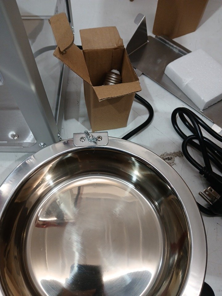 The main unit appears new. The metal warmer has some heat stress/discoloration.