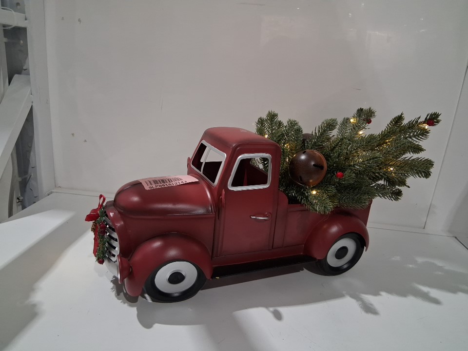 Tested for power One headlight doesn't light up, one wheel is bent in but can be fixed and the tree is broken out of the holder but it was just glued in so can also be fixed. As well some fake pinecones missing