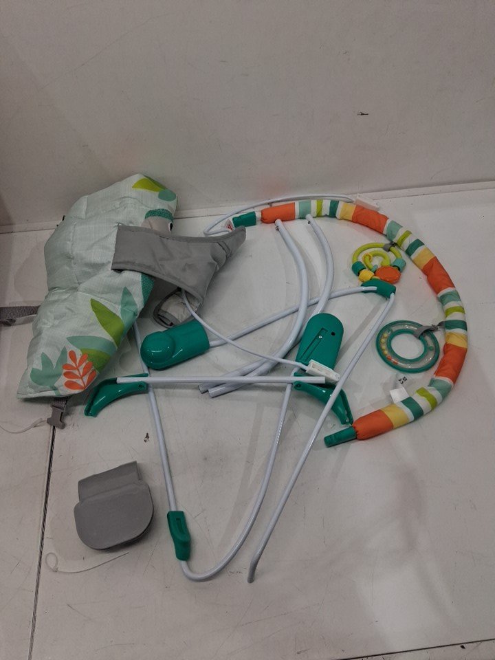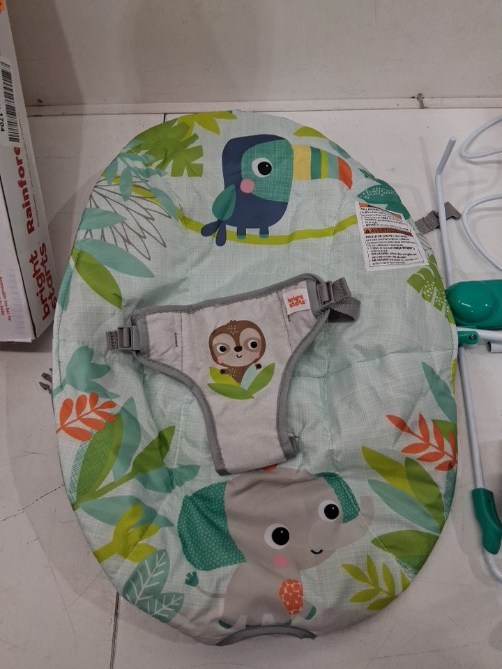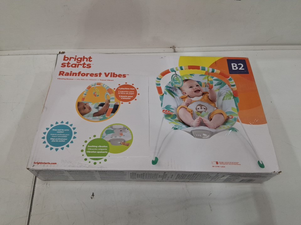 BRIGHT STARTS RAINFOREST VIBES PORTABLE 3-POINT HARNESS VIBRATING BOUNCER WITH TOY-BAR - RAINFOREST VIBES (MODEL: 12227)