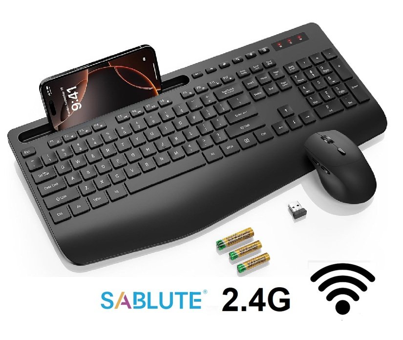 SABLUTE Wireless Mouse and Full Size Keyboard Set with 2.4G USB Receiver and phone holder - Black (model: ‎KC213D)