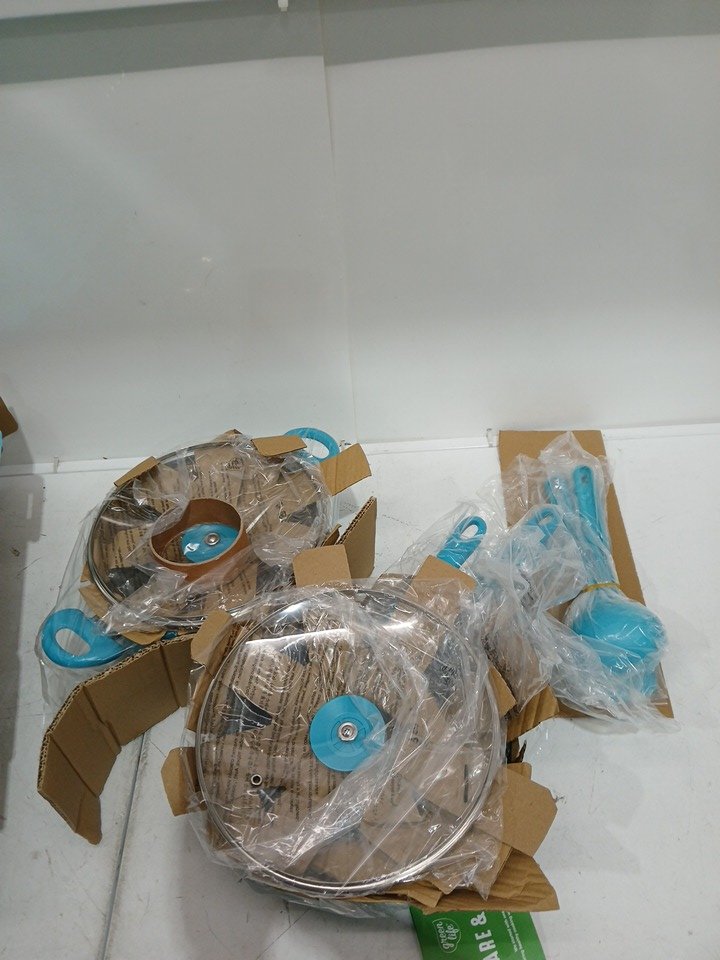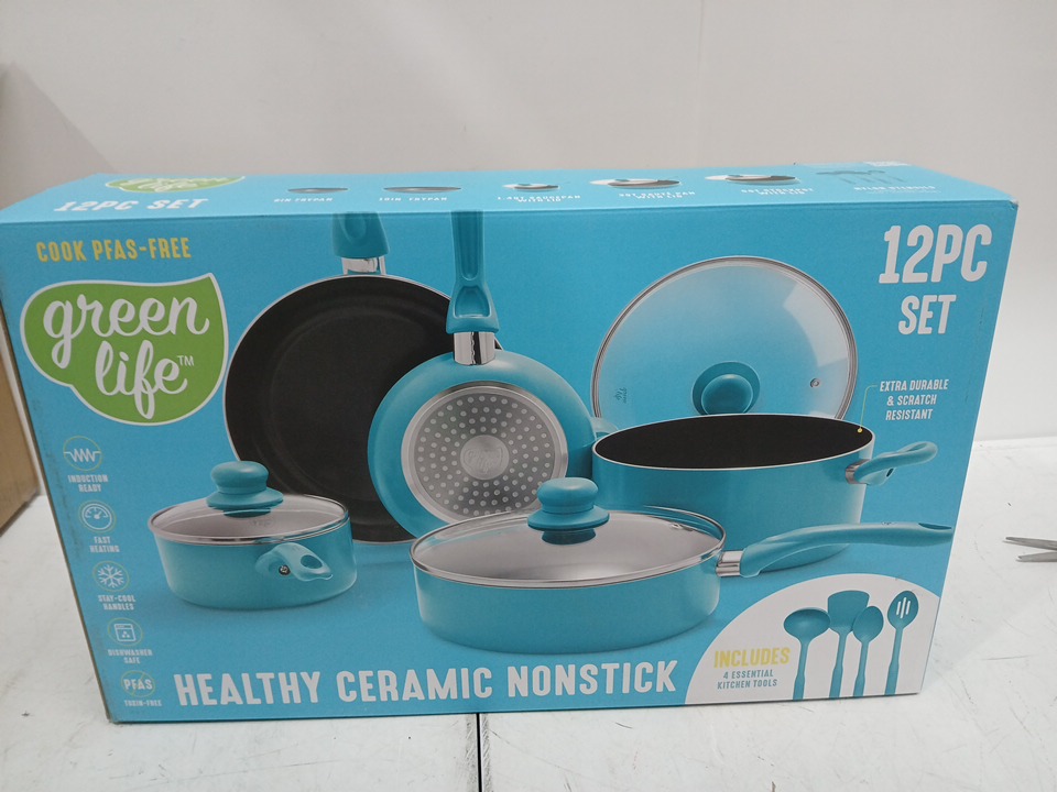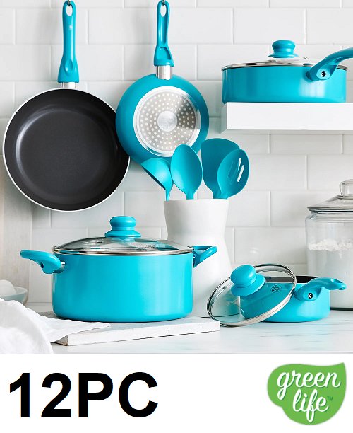 12PC GREENLIFE SOFT GRIP CERAMIC NON-STICK COOKWARE POTS AND PAN SET - turquoise