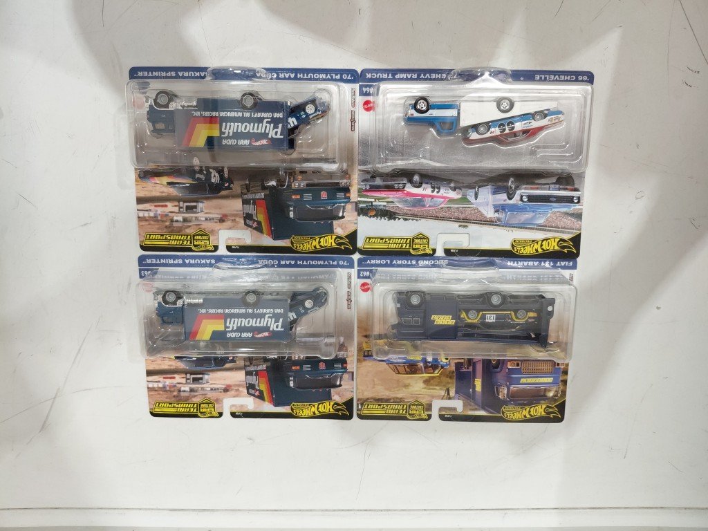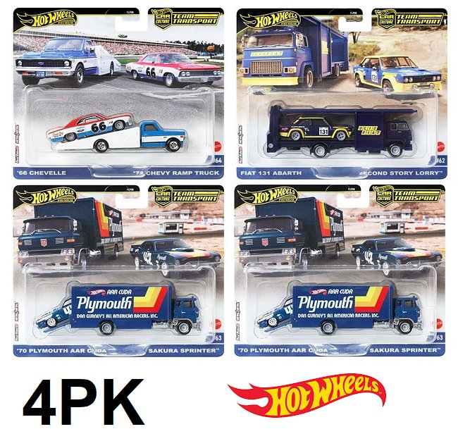 4pk hot wheels car culture team transports - '66 chevelle & '73 chevy ramp truck/ fiat 131 abrath & second story lorry/ '70 plymouth aar cuda & sakura sprinter