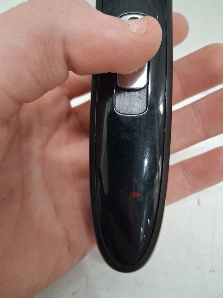 There is a little bit of hair in the trimmer from previous use and will need to be cleaned, there are also 2 small scratches on one side of the trimmer. Tested for basic power.