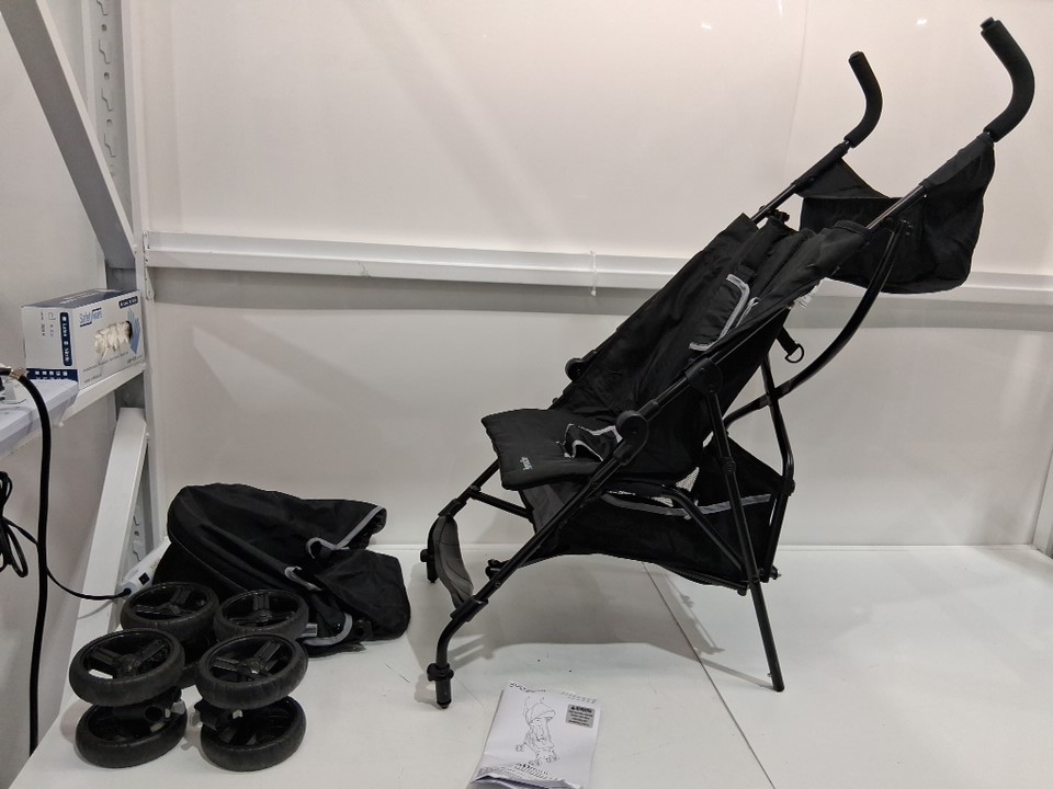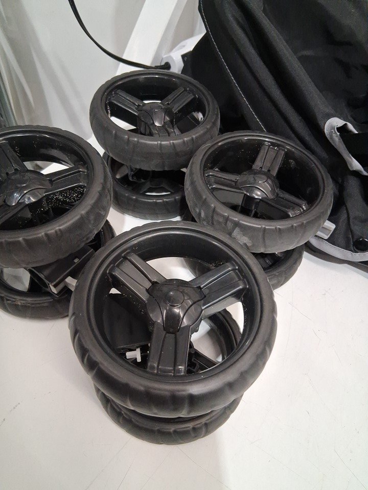 please note, the wheels do show signs of minimal wear and the is fine debris on the seat and along its creases. easily cleaned.