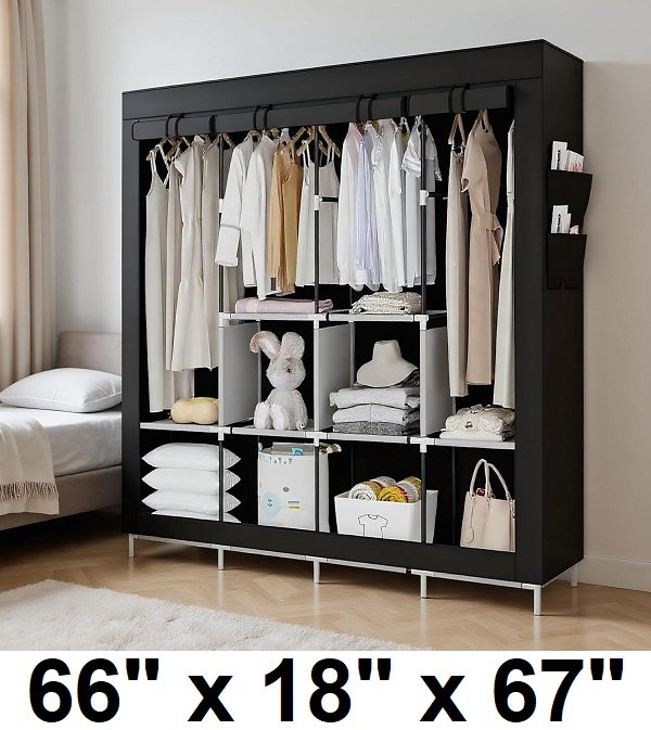UDEAR PORTABLE WARDROBE CLOSET CLOTHES ORGANIZER, 6-STORAGE SHELVES, 2-HANGING SECTIONS AND 4-SIDE POCKET - 66" x 18" x 67" - BLACK (MODEL: GY-49)