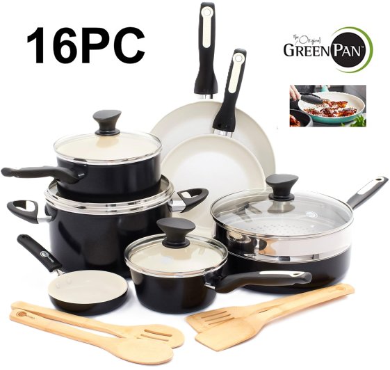 16PC GreenPan Rio Healthy Ceramic Nonstick Cookware Pots and Pans Set, PFAS-Free, Dishwasher Safe, BLACK