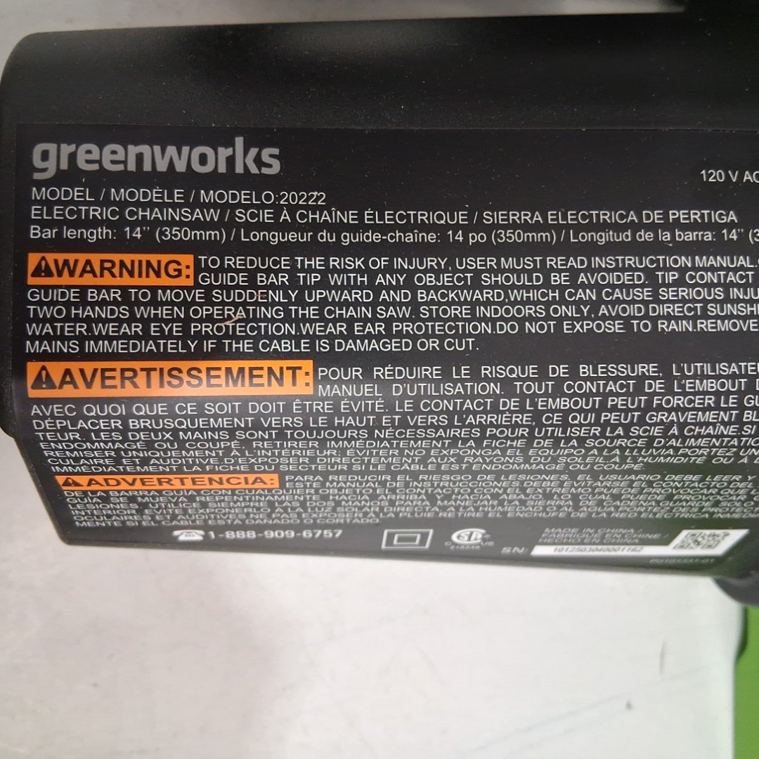 GREENWORKS ELECTRIC/CORDED CHAINSAW - 14" BLADE - 10.5A - GREEN (MODEL: 20222CA)