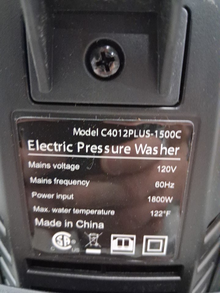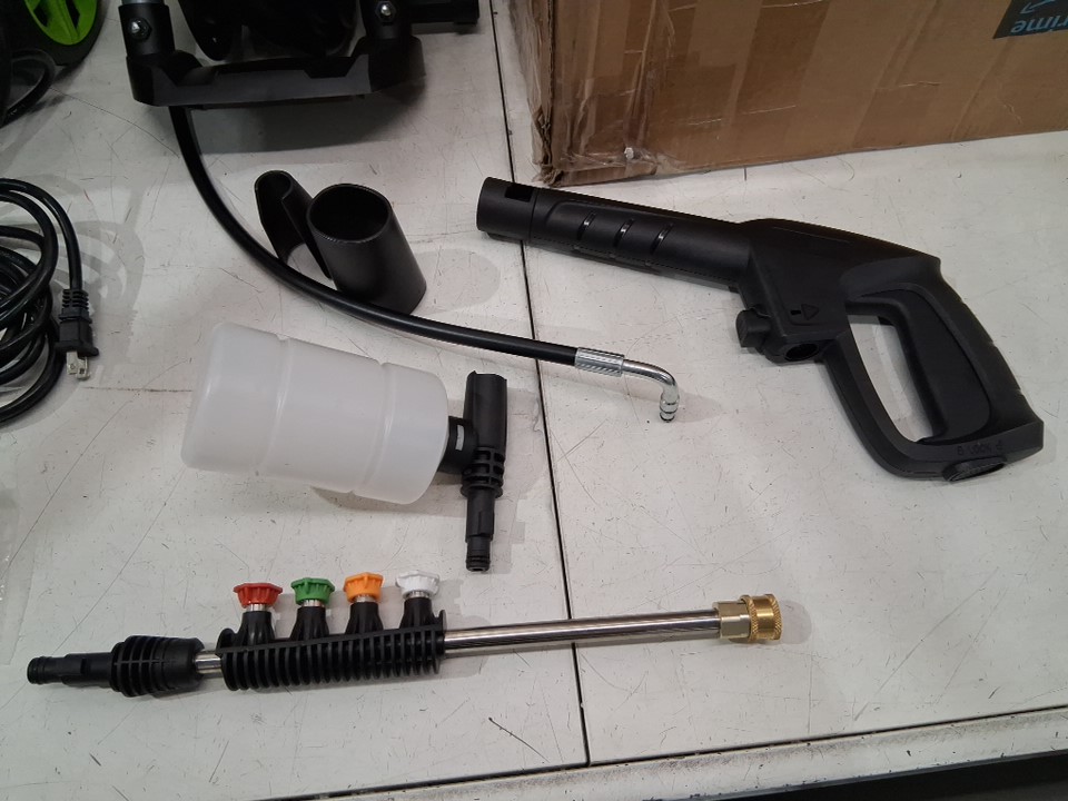 A bit of water came out of the pressure washer when it was tested for power indicating previous use. Please note that the plastic hook piece is damaged and may not attach properly (see photos)