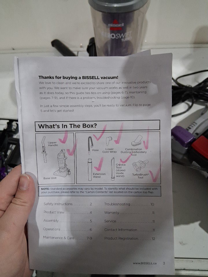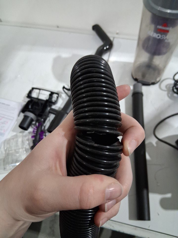 Products hose has a tear in the middle as well as light dust, dirt and hair on vacuum itself (see photos) Tested for power