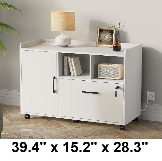 Rolanstar File Cabinet with Charging Station and Locking Drawer - 39.4" x 15.2" x 28.3" - white (model: DC009-WE-100-RR)