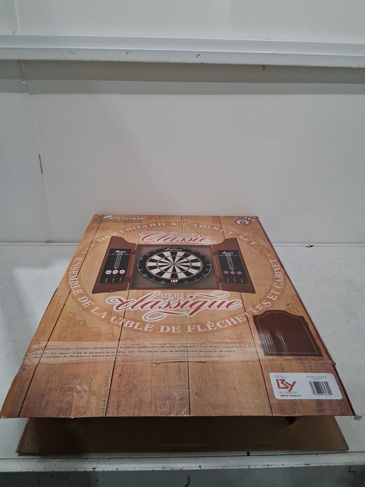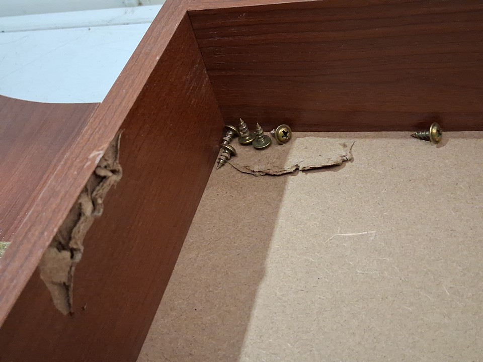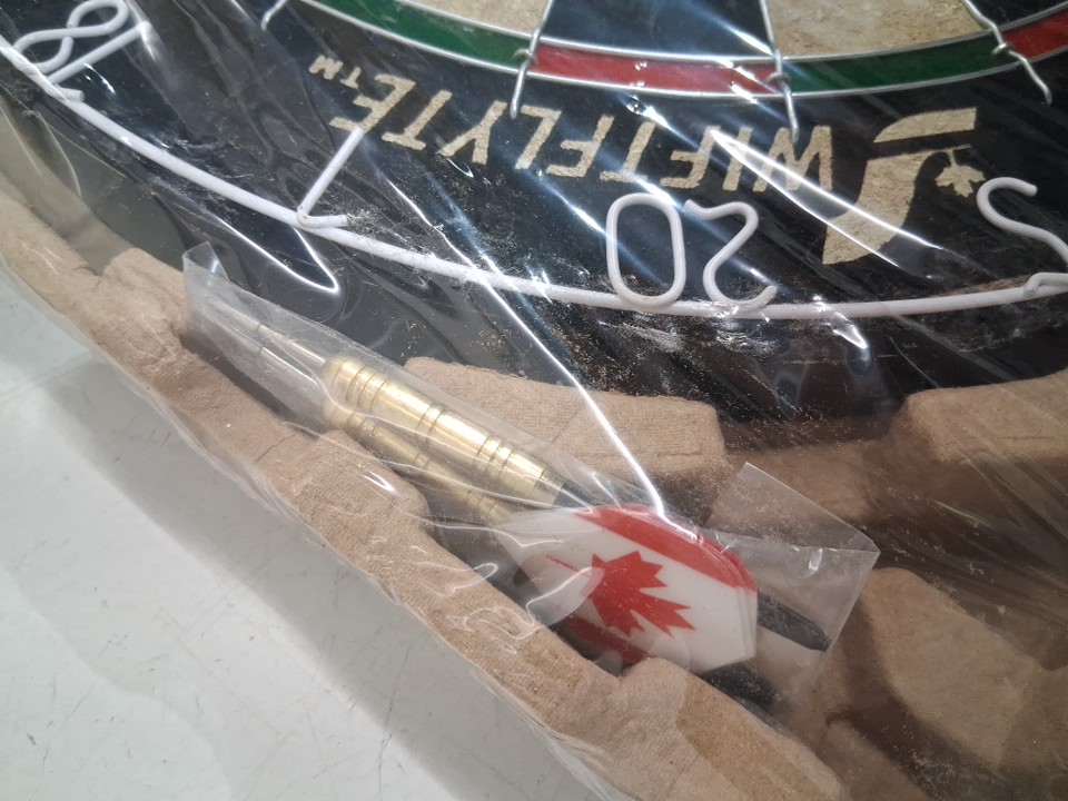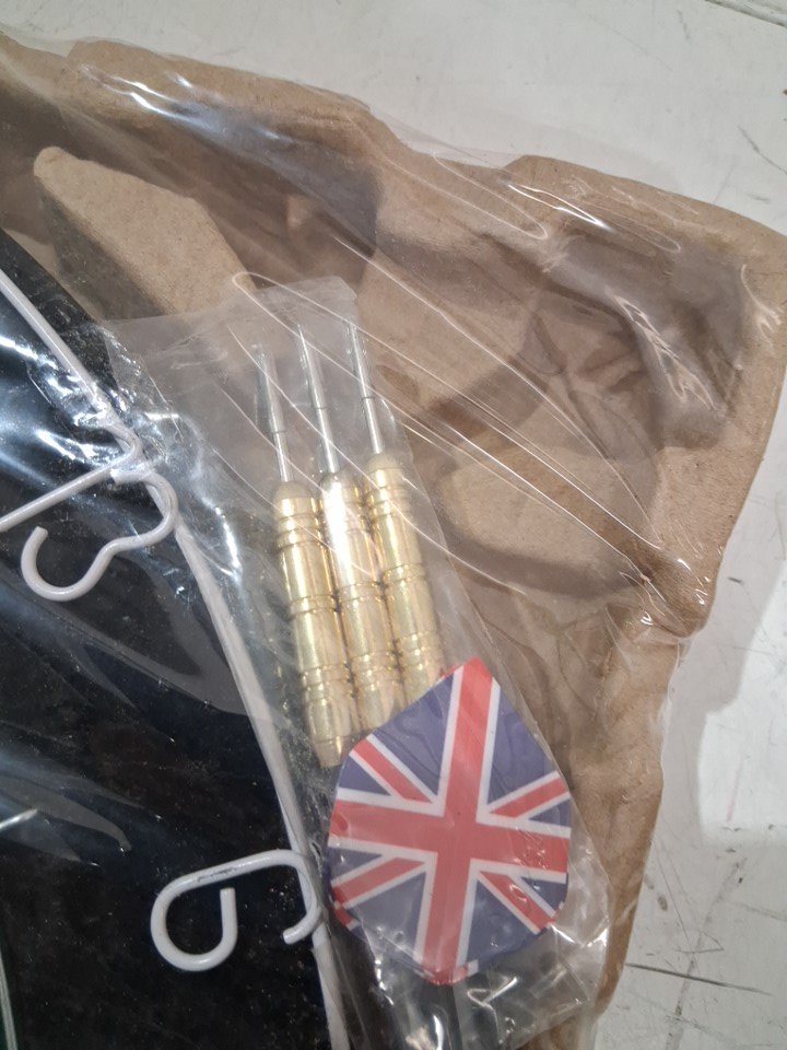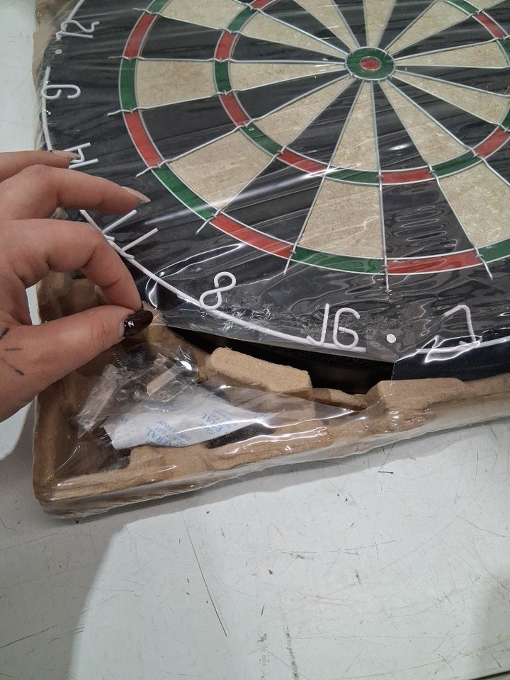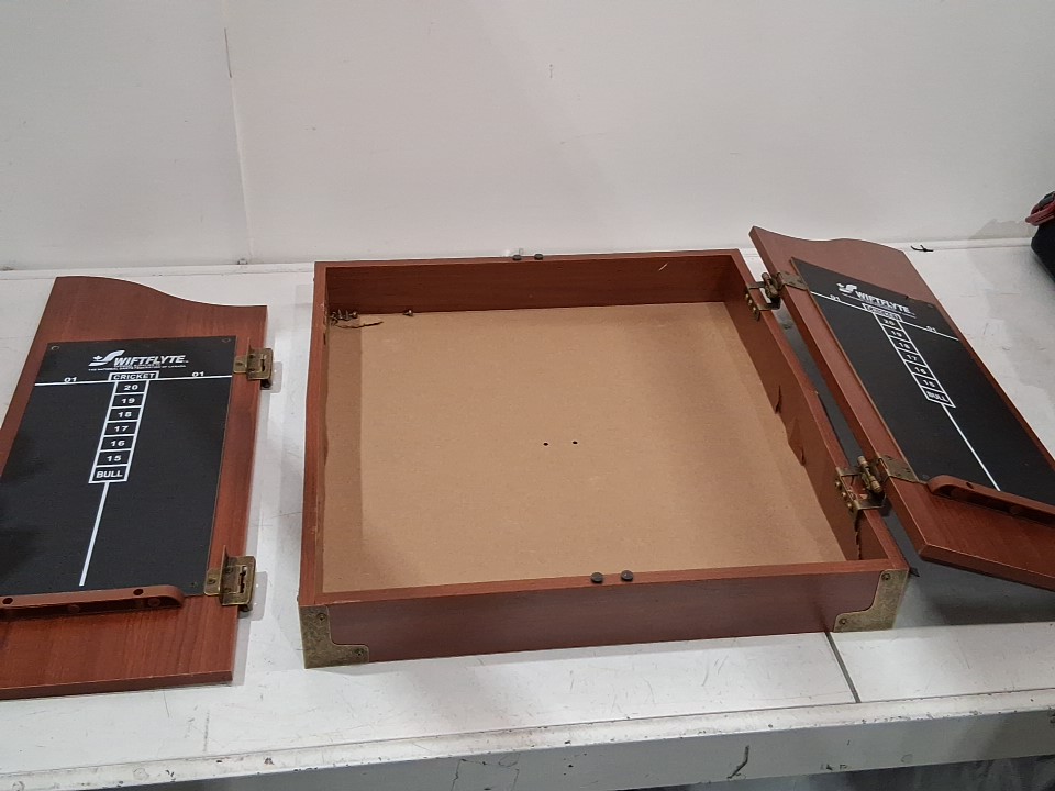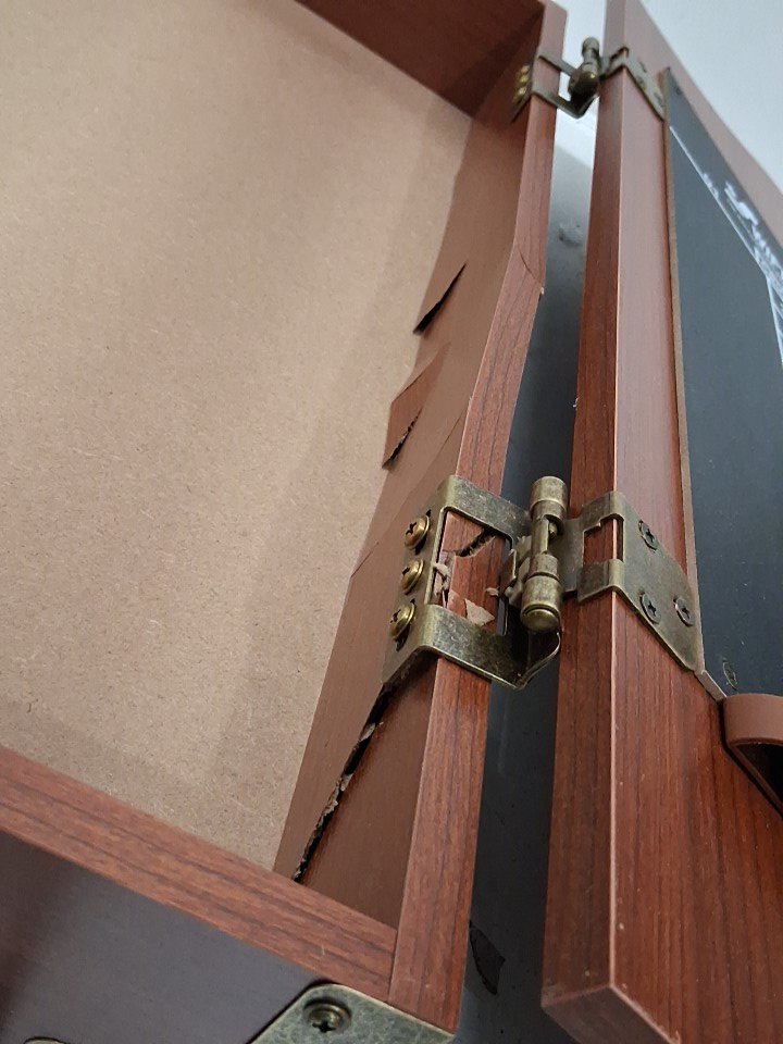 wooden frame for dartboard has cracked in some places as well as the hinges on the left door have come loose. dartboard and darts are unaffected