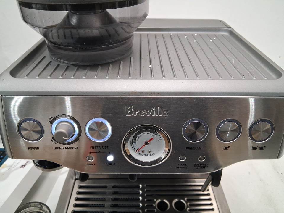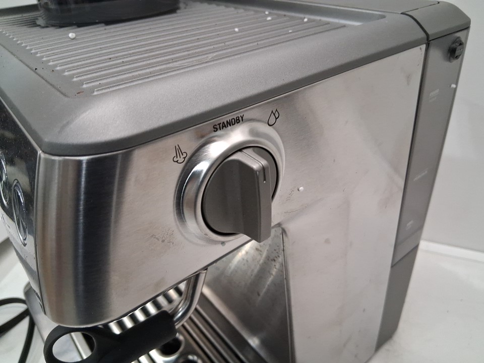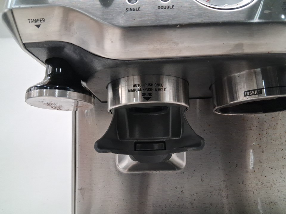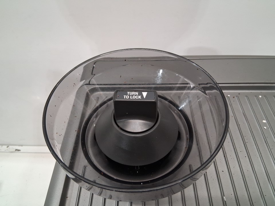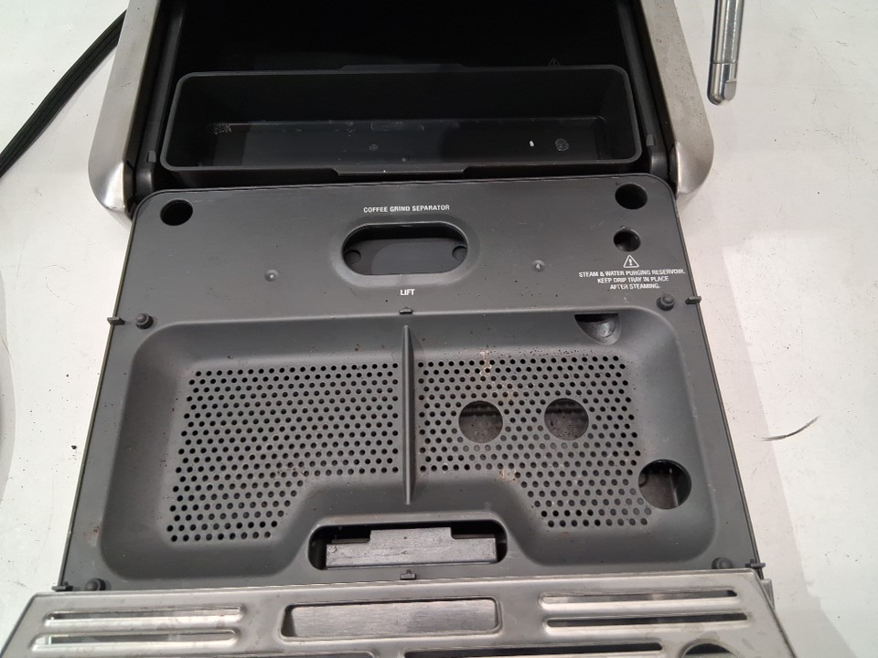 + Missing portafilter + + The drip tray is cracked and will need to be replaced + + Tested for basic power and grind function +