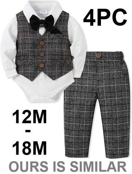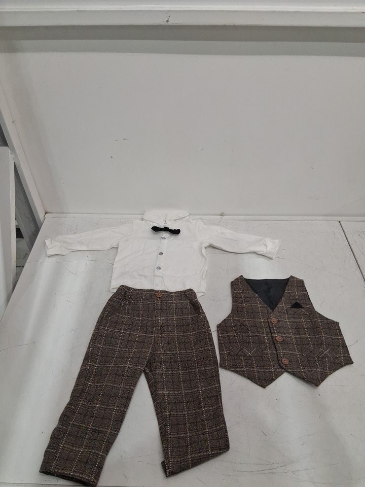 4PC Boy's Disaur Long Sleeve Christening Outfit for toddler's - 12 Months-18 Months - Plad/Brown/White