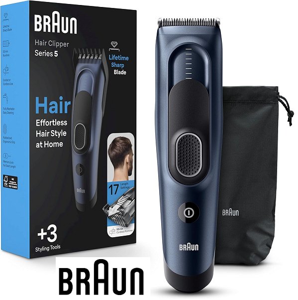 Men's Braun Hair Clippers Series 5 5350 with Memory SafetyLock Recall Setting and Ultra-Sharp Blades - 17 Length Settings and 2 combs - blue - (model: 5427