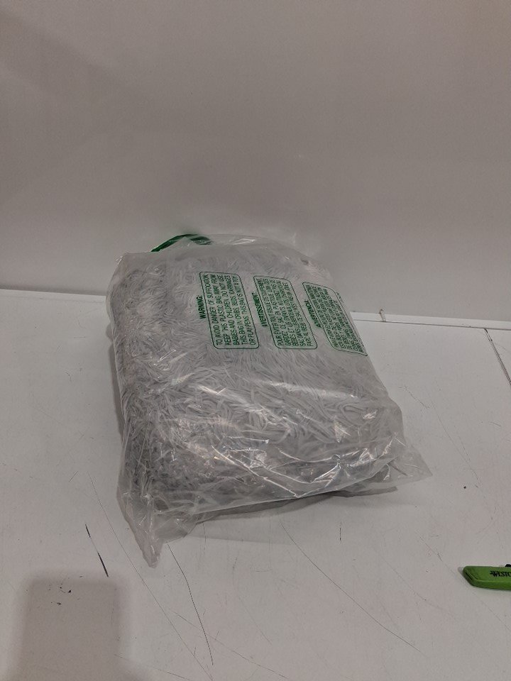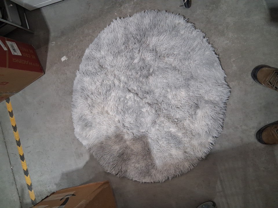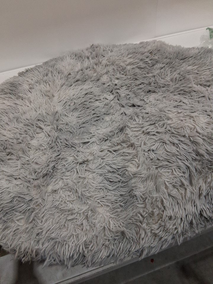 this does smell of laundry detergent or room freshener. please note this could use a brush through given its texture to bring back the fluffiness.