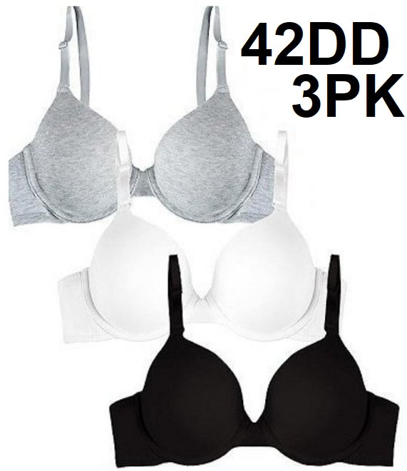 3pk women's fruit of the loom underwire non-padded t-shirt bras - 42DD - black/white/gray (style: ft797pk)