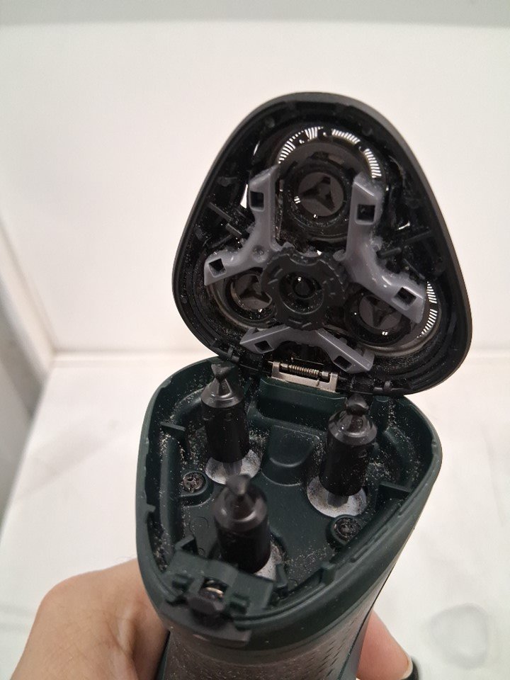 Light hair and stubble residue in shaver chamber indicates prior short-term use. (See photos)