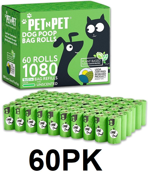 60pk (1080 BAGS) PET N PET USDA-CERTIFIED 100% RECYCLED, 38% BIOBASED LEAKPROOF UNSCENTED DOG POOP BAGS - 9" x 13" - GREEN
