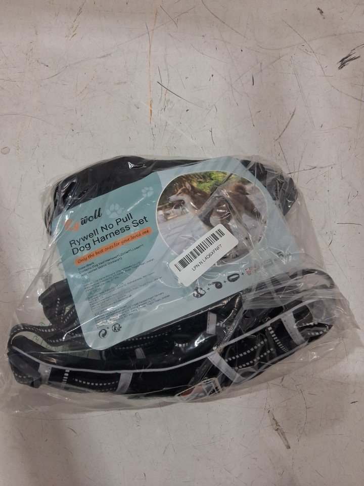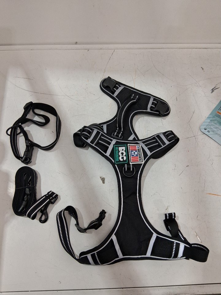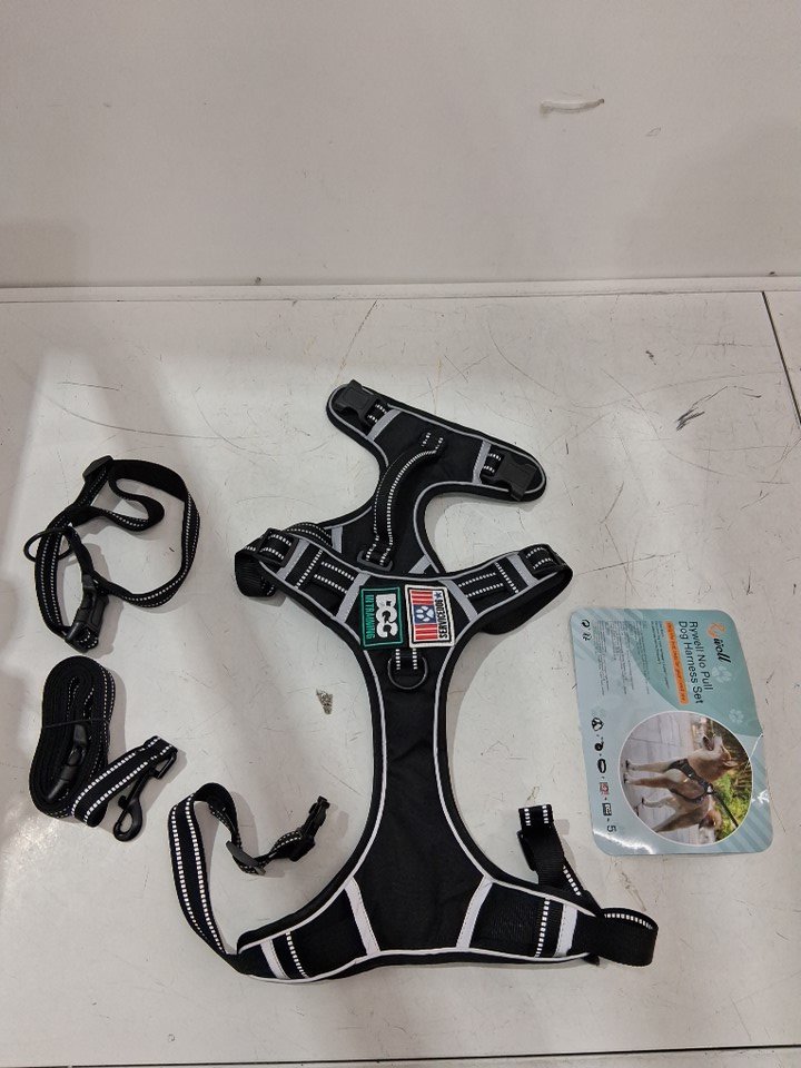 5PC RYWELL ADJUSTABLE NO PULL DOG HARNESS, LEASH AND COLLAR SET W/ 2 PATCHES - EXTRA LARGE - BLACK/GREY