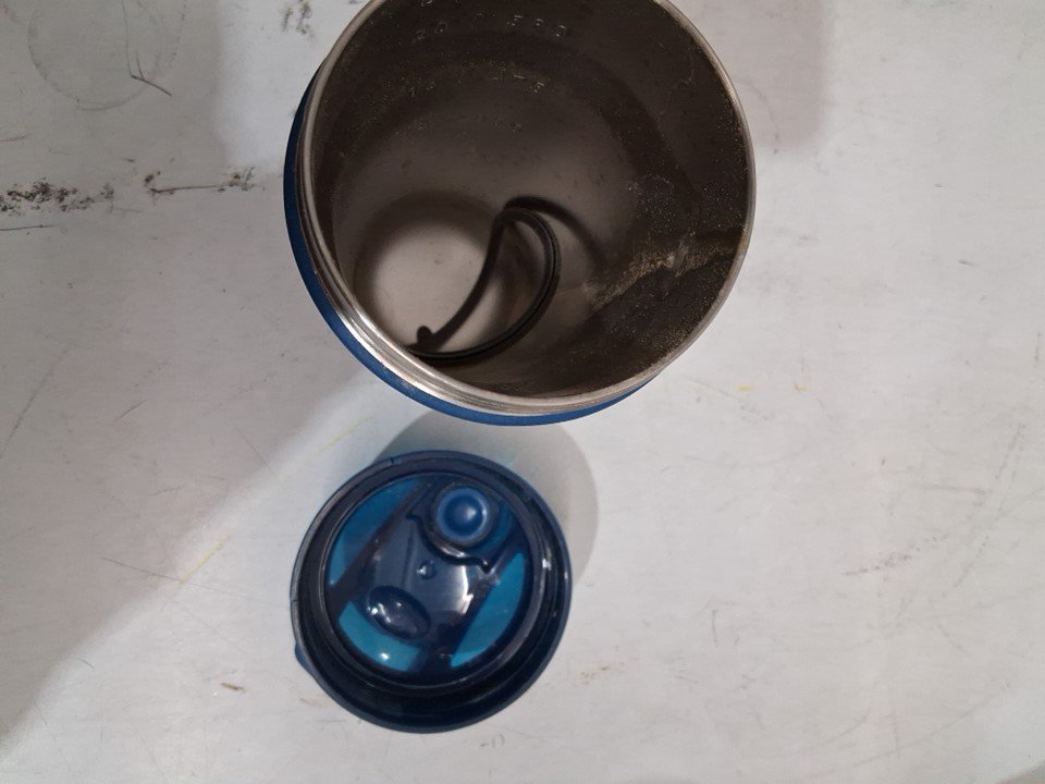 cracked lid, liquid stains inside the bottle. MISSING SHAKER BALL