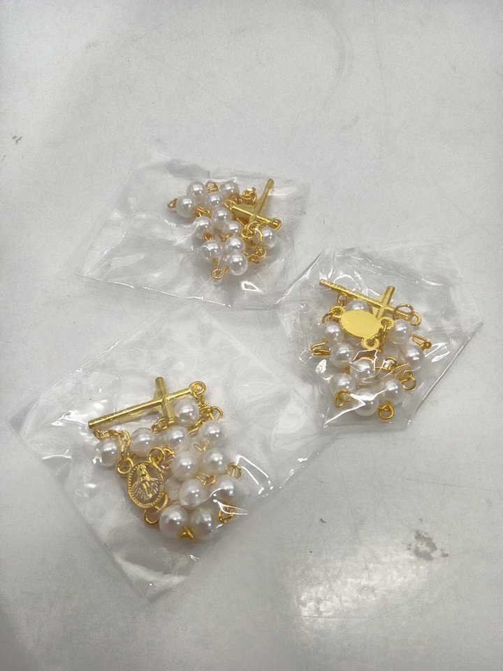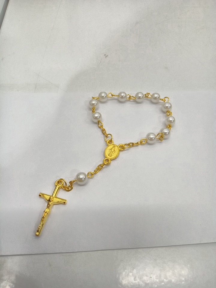 3 infant/toddler communion baptism pearl rosary bracelet cross - 4.5" - gold colour/ pearl