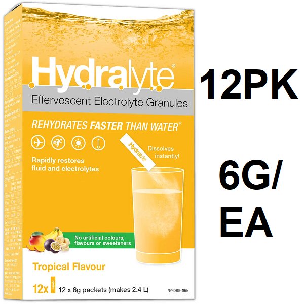 12pk hydralyte electrolyte granules - tropical flavour - 6g each