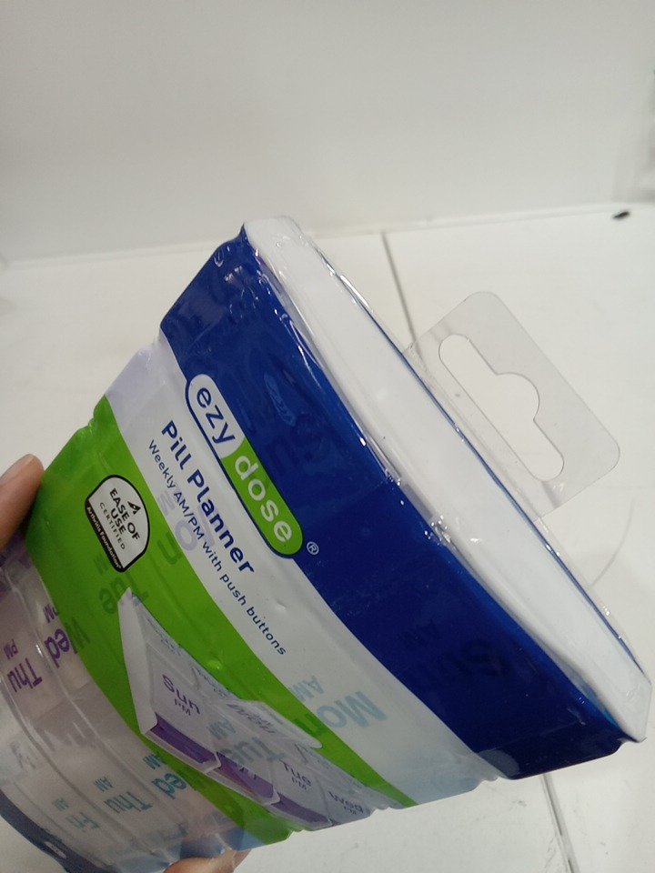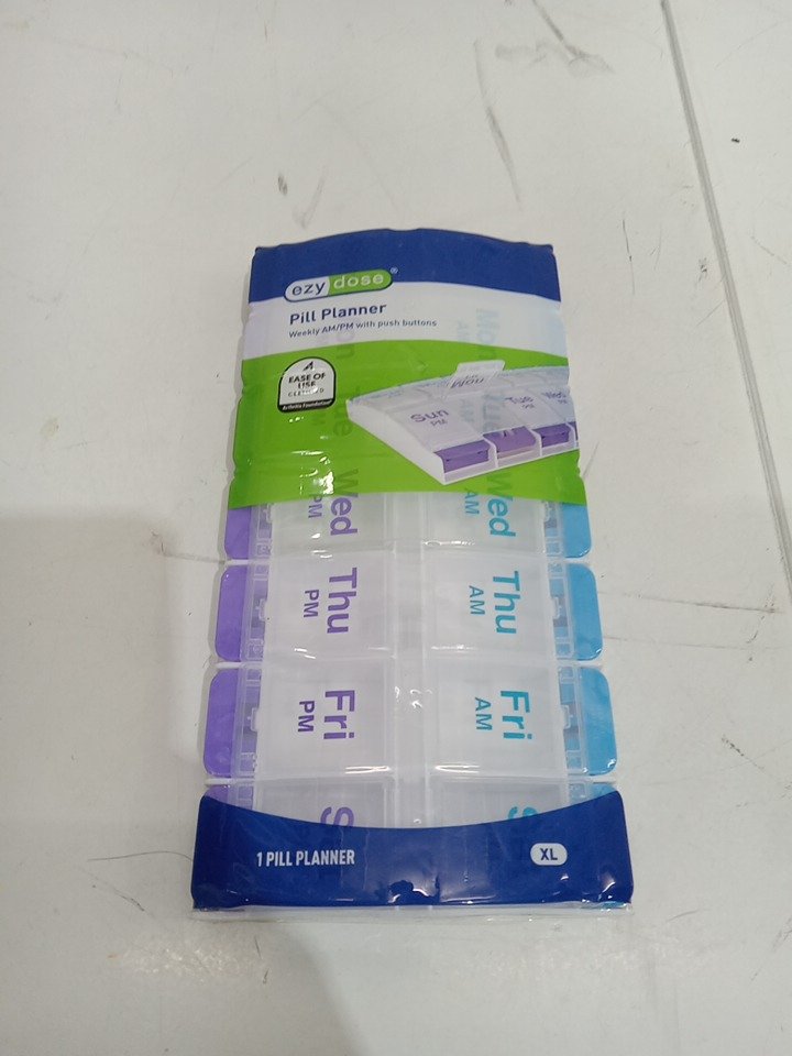 EZYDOSE WEEKLY AM/PM PILL ORGANIZER WITH LARGE COMPARTMENTS AND PUSH BUTTONS- clear/purple/blue