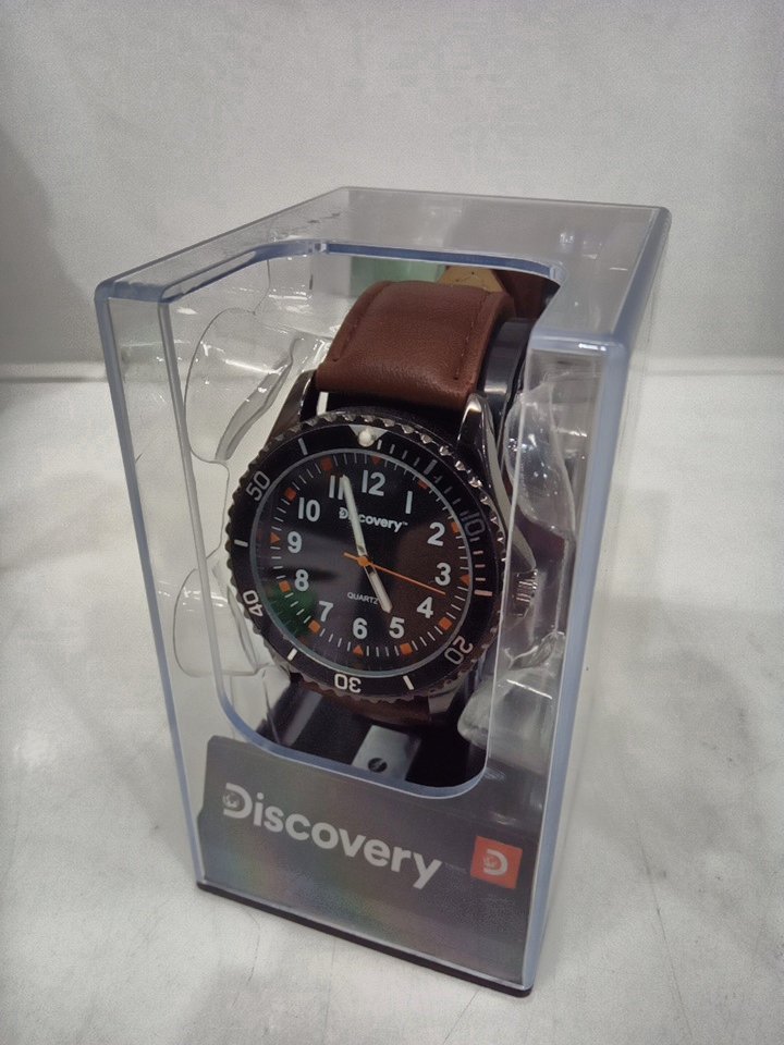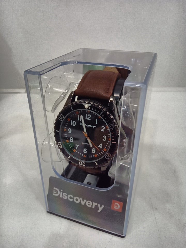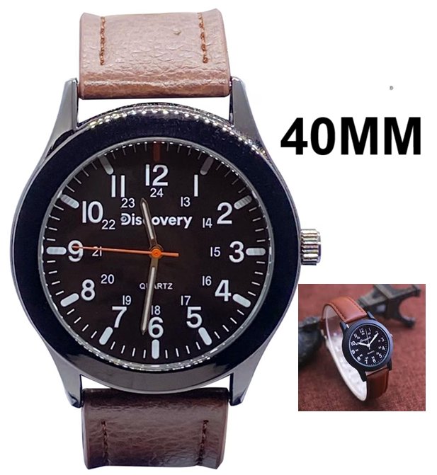 MENS discovery casual analog watch with genuine leather strap - 40mm - black dial / brown strap
