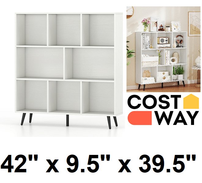 costway 8 cube bookshelf with tapered metal legs - 42" x 9.5" x 38.5" - 25lbs capacity per cube - 110lbs top shelf capacity - white (model: cb10953wh)