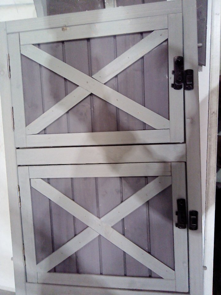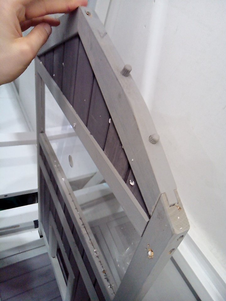 The panels are scratched and have dirt/scuffs on them. There are signs of previous installation around the peg and screw holes. Some of the wood pieces have minor chipping along the edges. Additional hardware may be required to fully assemble this enclosure. (SEE PHOTOS)