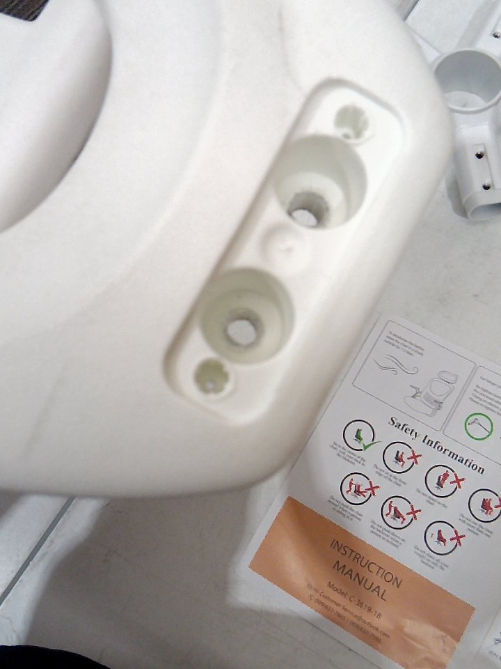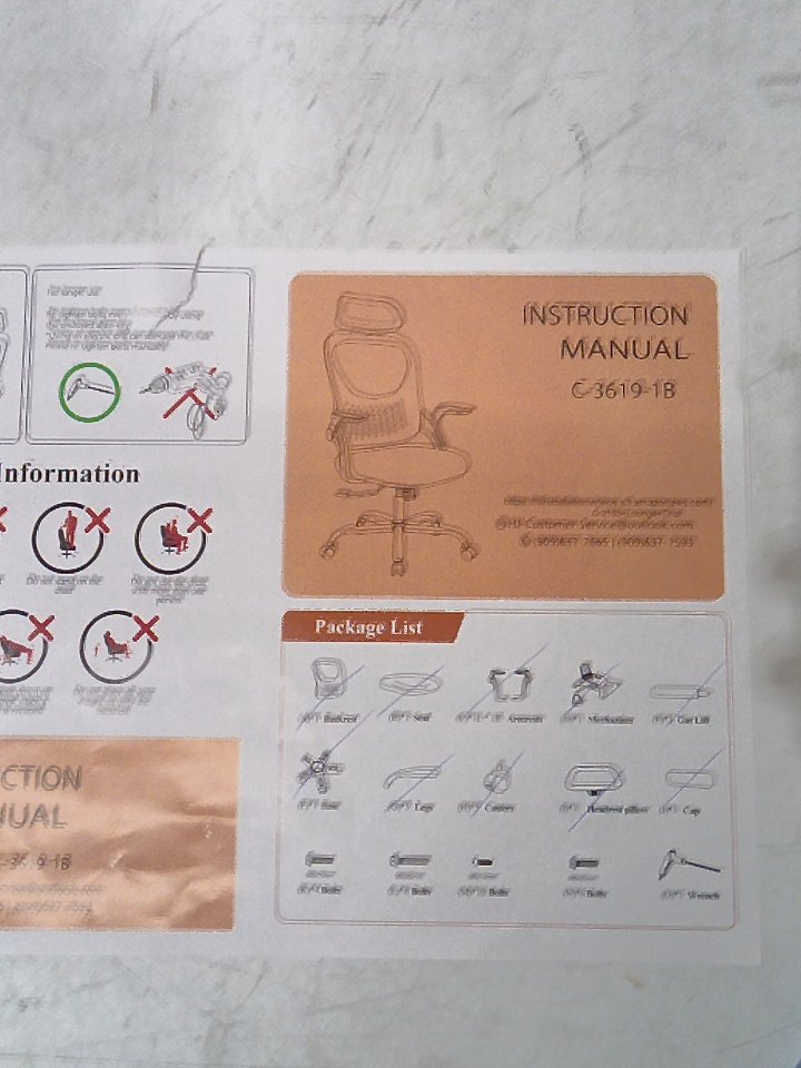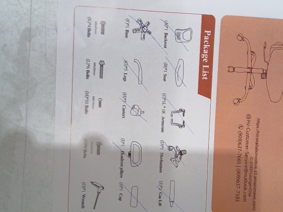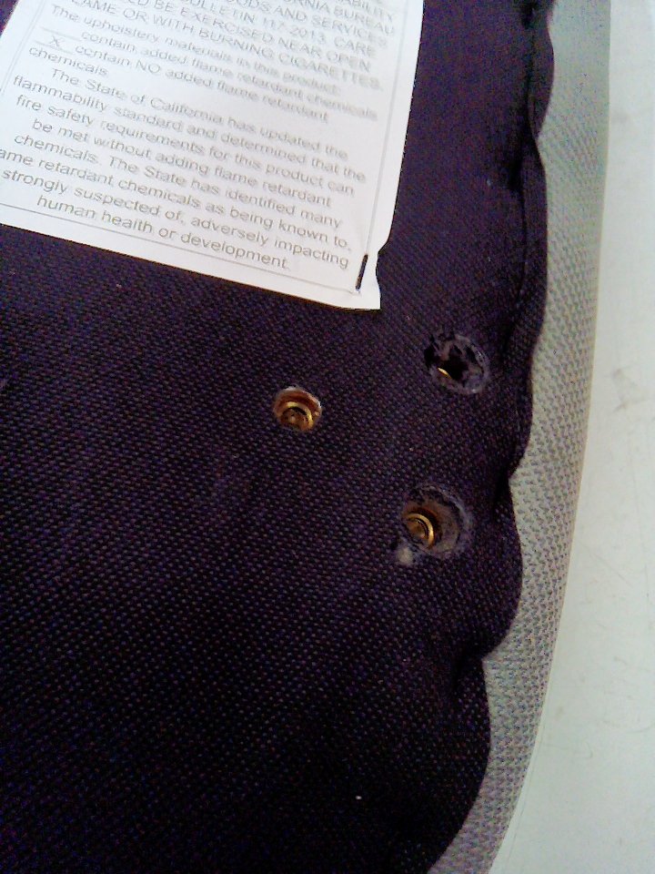 There are light markings on the bottom of the seat cushion piece and around the screw holes. Ours does not include any hardware, in order to assemble and use this chair you will need to purchase compatible hardware separately. (SEE PHOTOS)