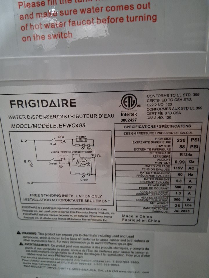FRIGIDAIRE TOP-LOAD WATER COOLER/DISPENSER - FITS 3-5 GALLON BOTTLES - WHITE (MODEL: efwc498)
