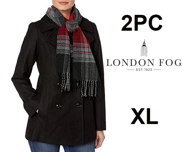 2PC WOMENS LONDONG FOG Double Breasted Peacoat with Scarf - EXTRA LARGE - BLACK