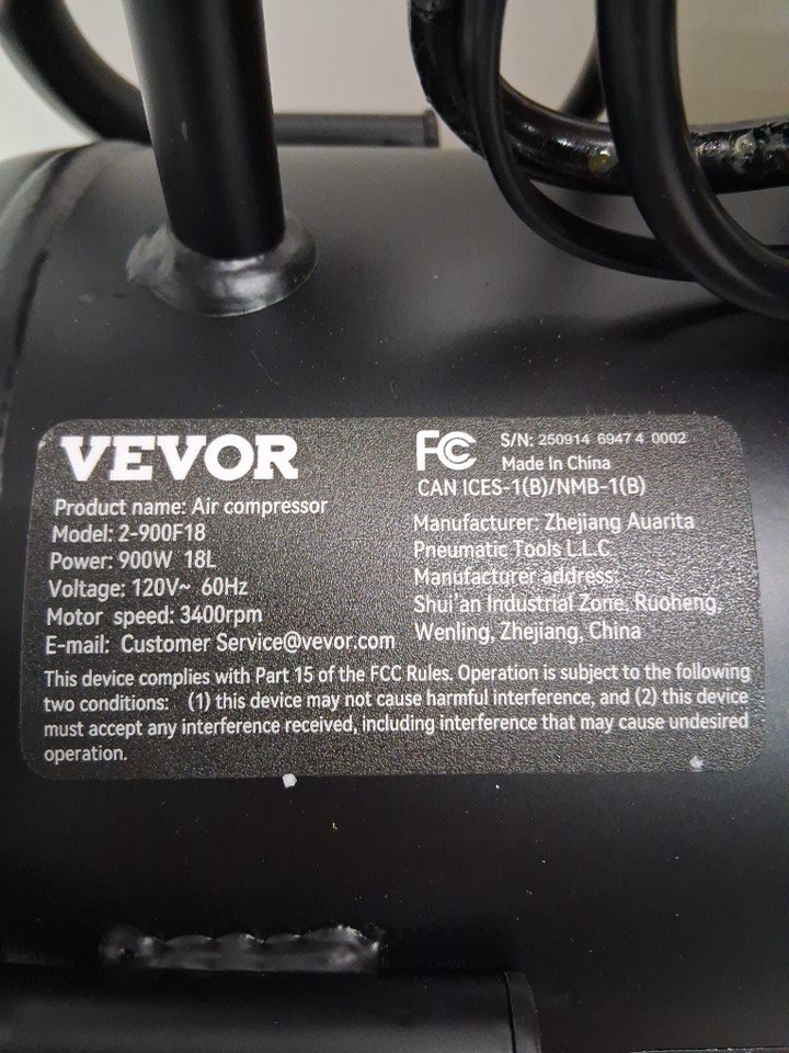VEVOR AIR COMPRESSOR - 4.8GAL - 90PSI -OIL FREE - 2.2CFM - BLACK/ORANGE - (MODEL:2-900F18)