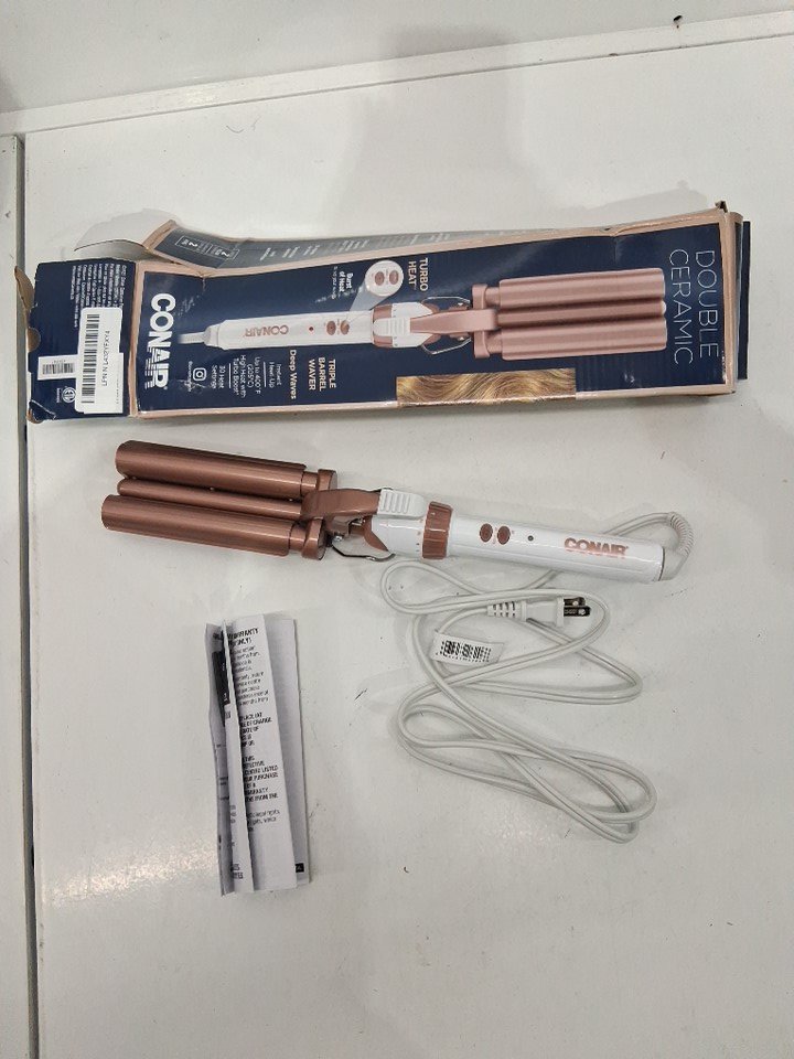 CONAIR DOUBLE CERAMIC TRIPLE BARREL CURL STYLING WAVER FOR DEEP WAVES - 3/4" BARRELS - WHITE/ROSE GOLD - (MODEL: CD704C)
