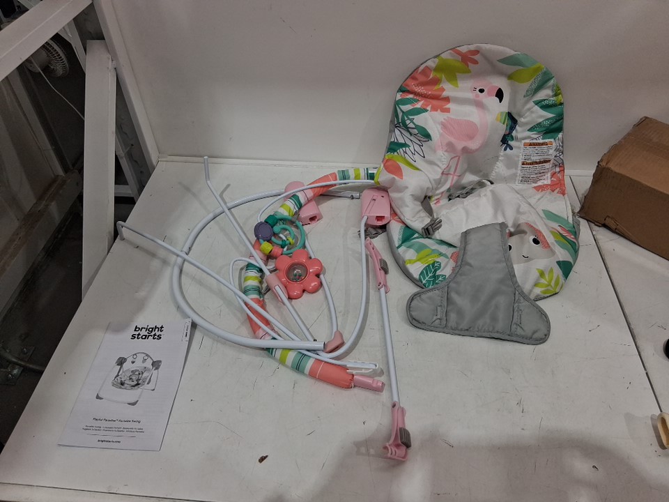 BRIGHT STARTS 3-POINT HARNESS HARNESS VIBRATING BABY BOUNCER WITH-TOY BAR - FLAMINGO VIBES - multicolour (MODEL: 12228)
