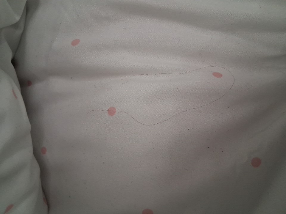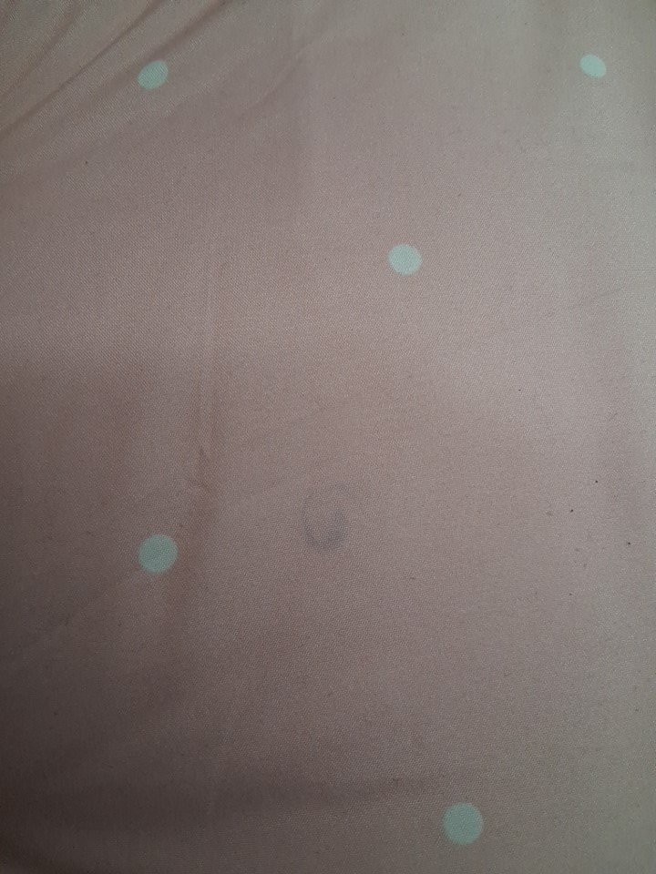 There is one small scuff mark/stain and a couple pieces of hair on the blanket from previous use. The scuff mark may come out after a wash.