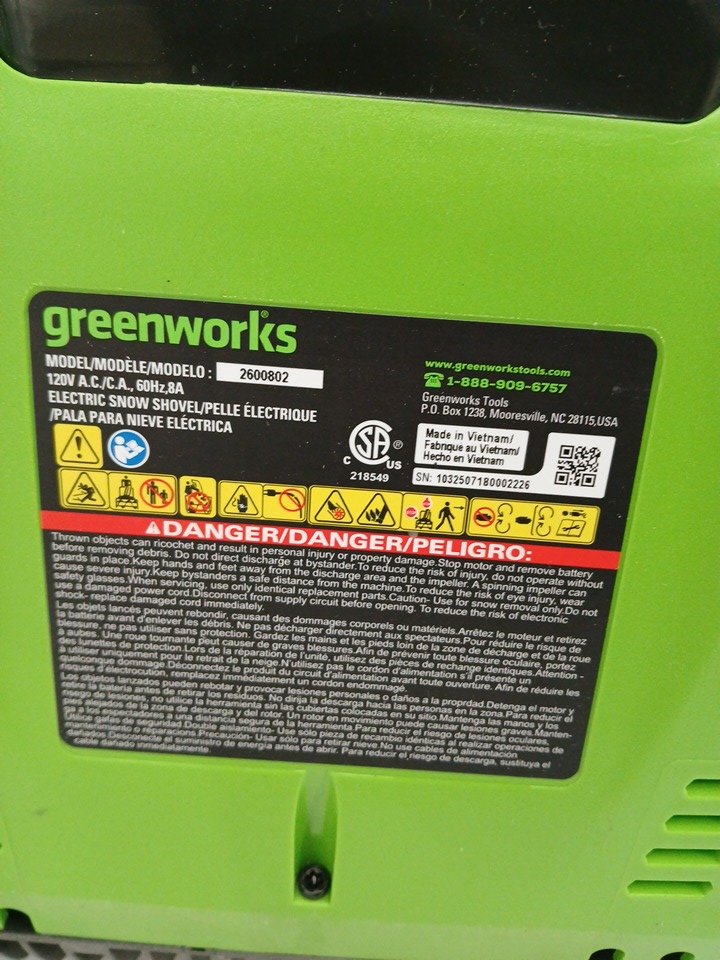 greenworks Corded and brushless Snow Shovel - 12" - green (model:2600802)