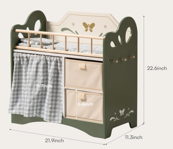 kids robud Doll Bed cabinet with Storage and Bedding for dolls up to 22" - 22" x 11.3" x 22.6" - green/cream (model: wdh12)