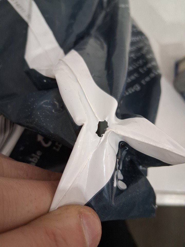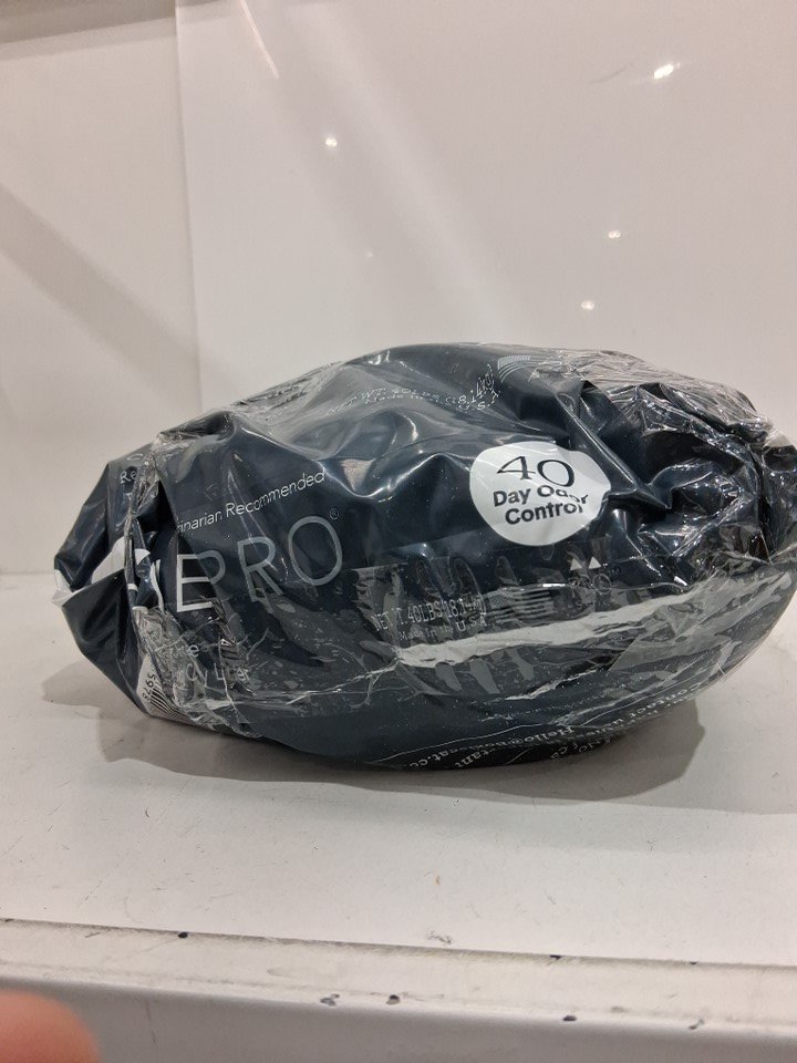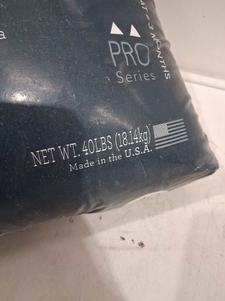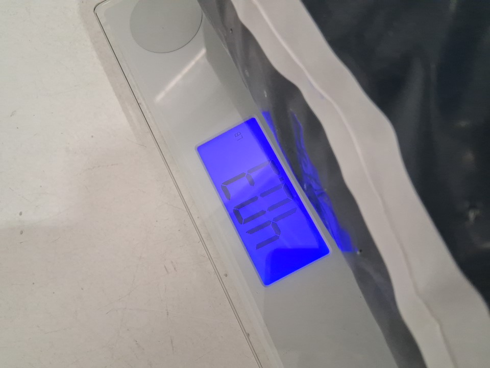 Does not appear to have lost enough to be accurately tracked on a scale. Close to 40LBS. Taped up to prevent further leaking, otherwise never used top still sealed. Bottom plastic is slightly distressed.