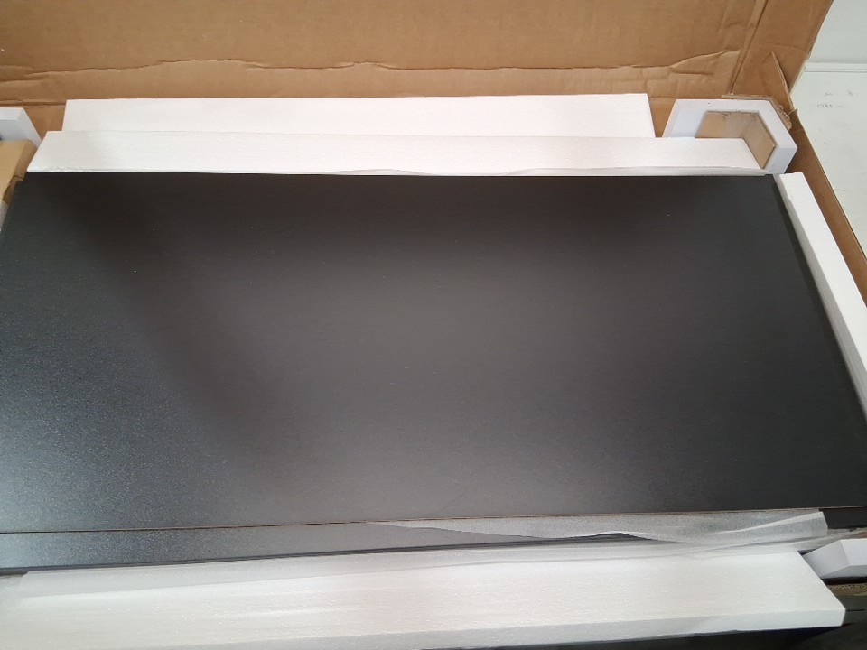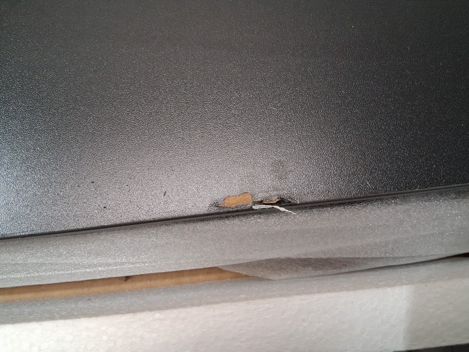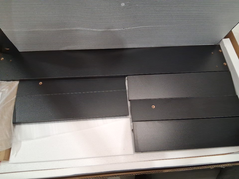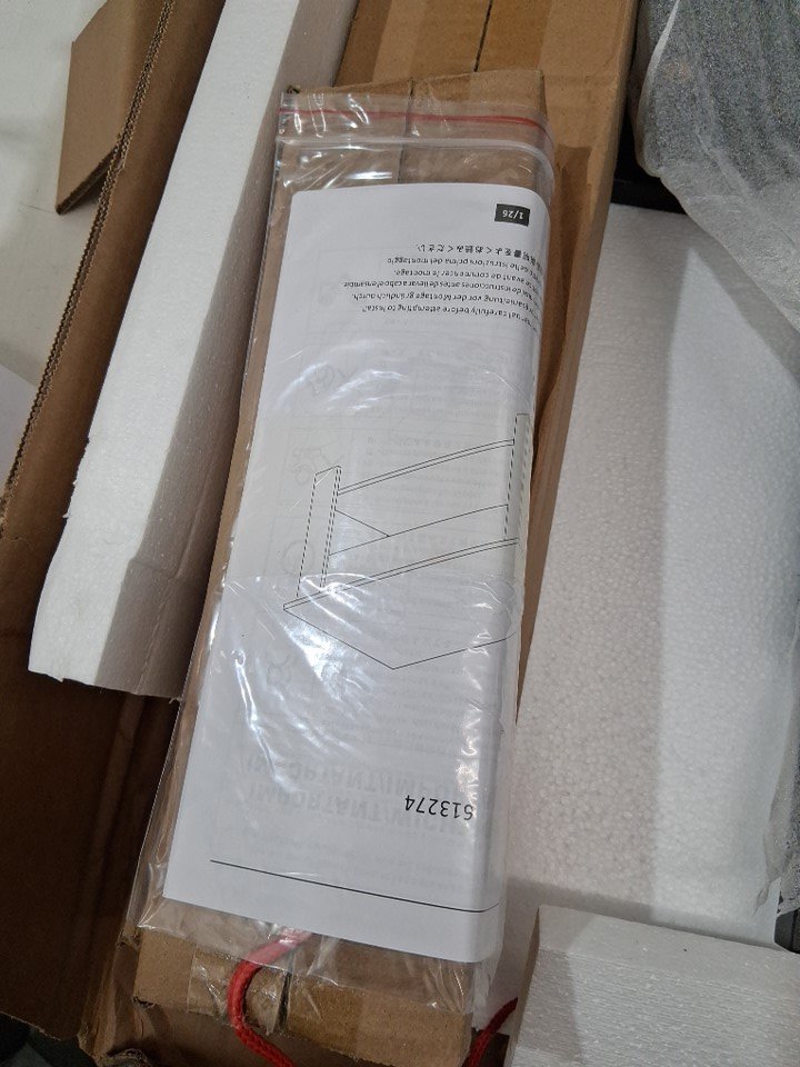 There is a small chip near one edge of the tabletop due to shipping - see photos. Outside of this cosmetic damage, all parts appear present and in new condition.