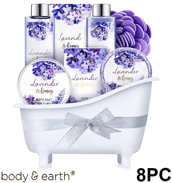 8pc body & earth bath set WITH BATHTUB CONTAINER - includes shower gel, bubble bath, scented candle, soap, lotion, bath salts - lavender/HONEY SCENTED