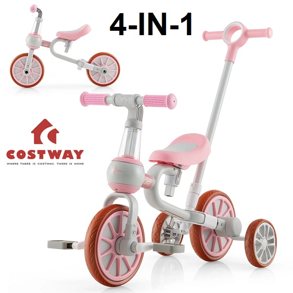 Costway 4-in-1 Kids Tricycle with Push Handle & Training Wheels Baby Balance Bike, Pink (MODEL: ts10070pi)