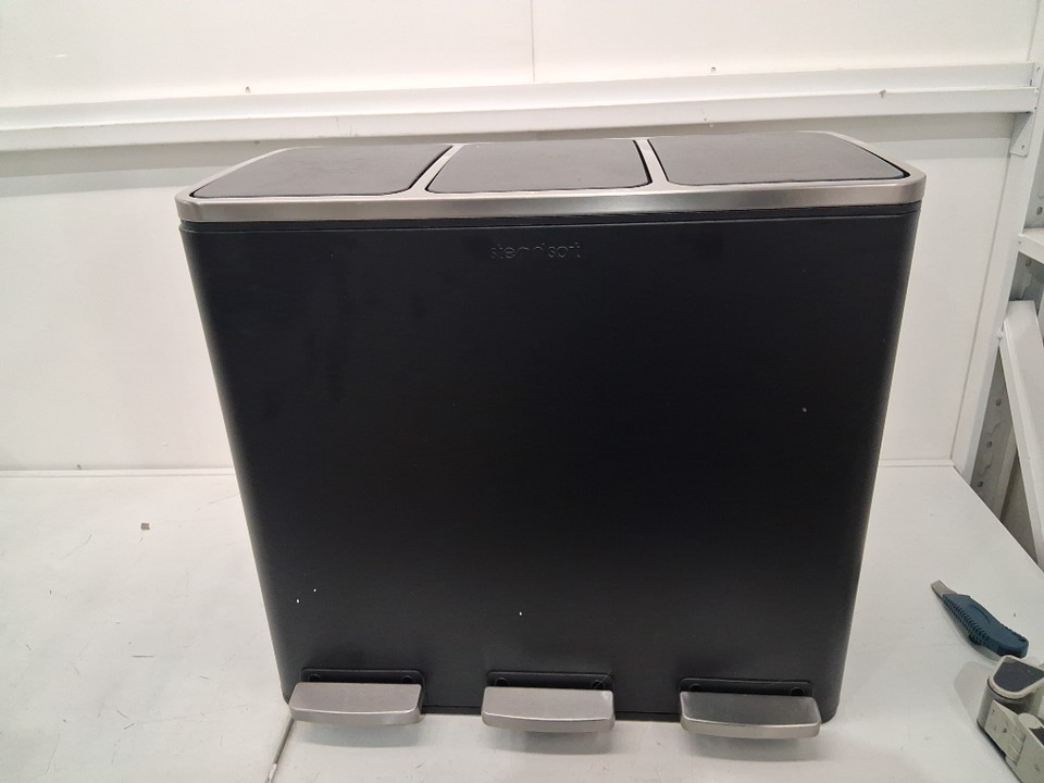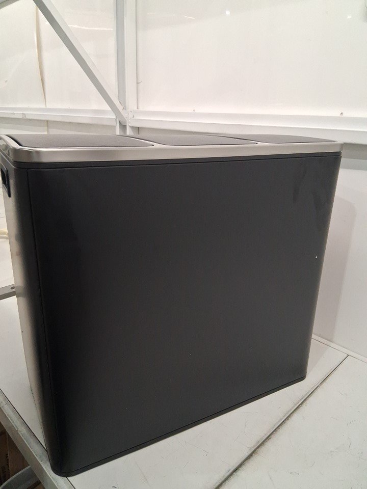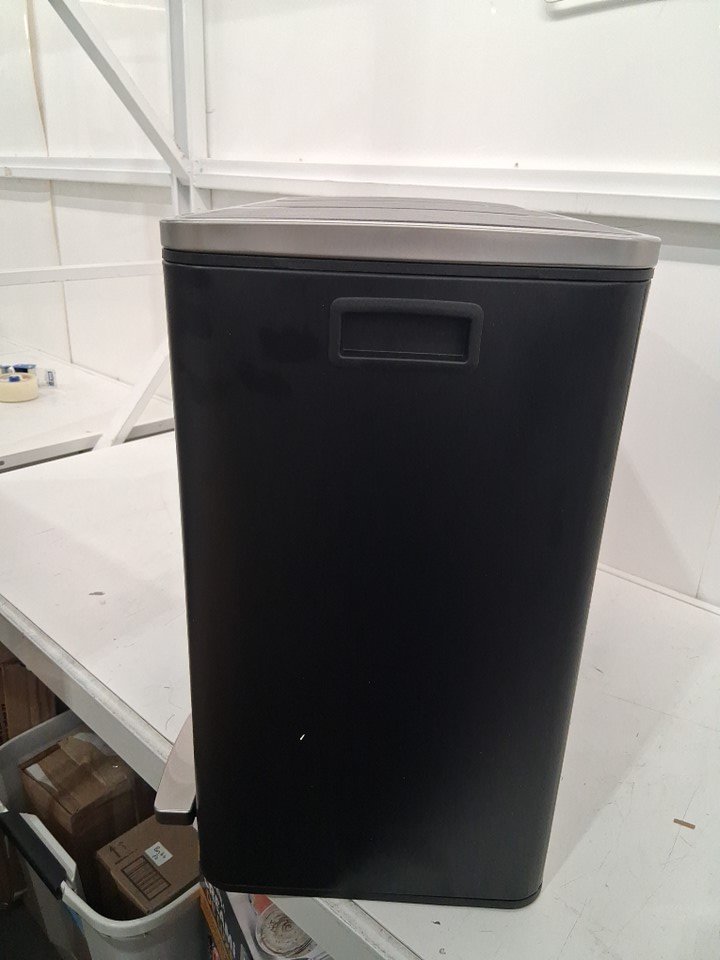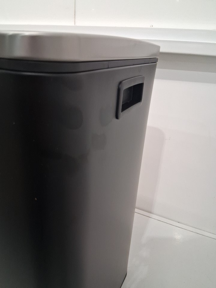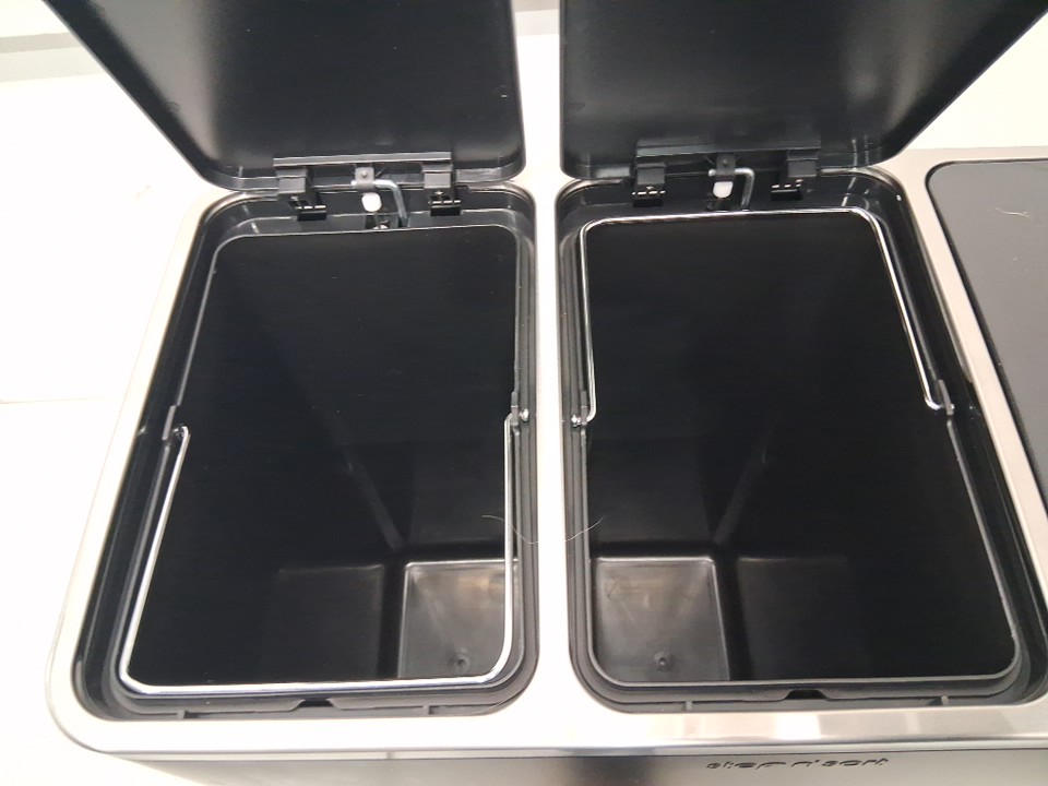 garbage bin has loose pet hair on it and finger smudges