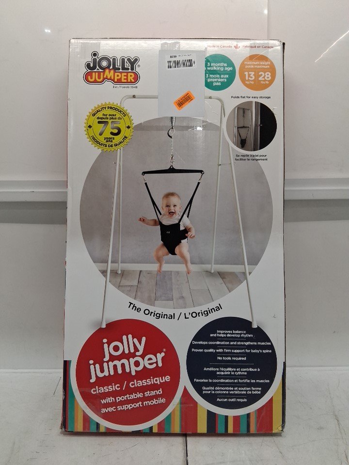 Jolly Jumper Classic Portable Baby Exerciser With Grey Fabric Saddle - 28 LBS Max - White/black (Model: 108)
