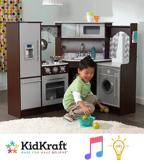 KIDKRAFT ULTIMATE CORNER WOODEN PLAY KITCHEN WITH LIGHTS & SOUNDS - BROWN/WHITE - (MODEL: 53365)