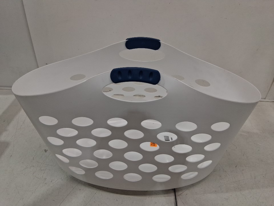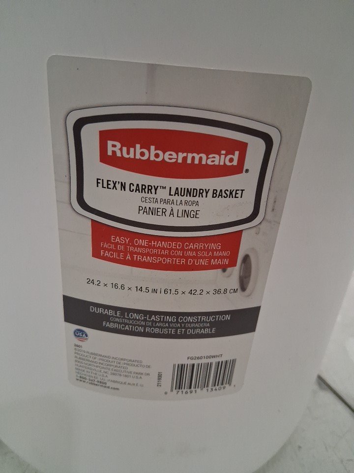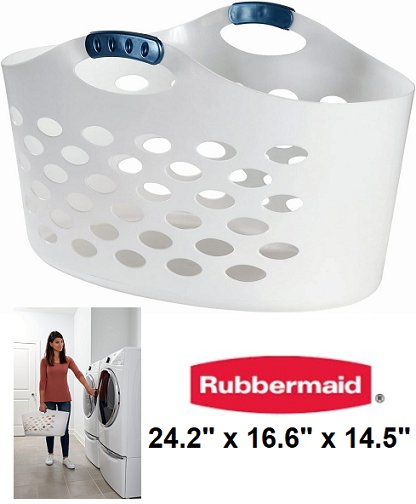 rubbermaid flex'n carry plastic laundry basket - 1.5 bushel - 24.2" x 16.6" x 14.5" - white/navy (model: ‎260100-WHT)